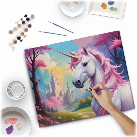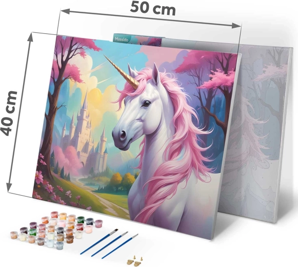 Scopri la magia della creatività con il kit di pittura con i numeri nel formato 40 × 50 cm. Il motivo dell’unicorno su tela di qualità intelaiata è pronto per essere dipinto. Nel set trovi 30 colori acrilici coprenti, 3 pennelli gratuiti di diverse dimensioni e ganci per appendere. Il fondo colorato con disegno sottile facilita la pittura anche ai principianti e garantisce un risultato bello e intenso.