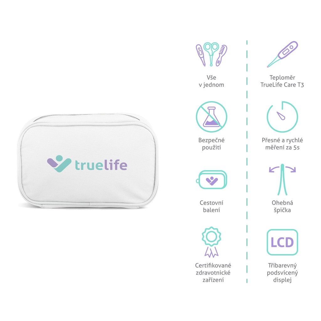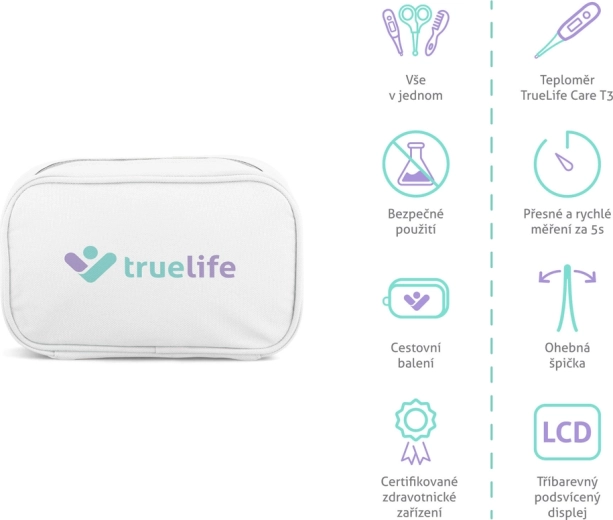 - Termometro TrueLife Care T3, aspiratore nasale, forbicine per unghie arrotondate, tronchesine per unghie, pettine, pennello con setole morbide, ditale spazzolino, 3× lima per unghie, astuccio da viaggio, manuali e istruzioni di sicurezza