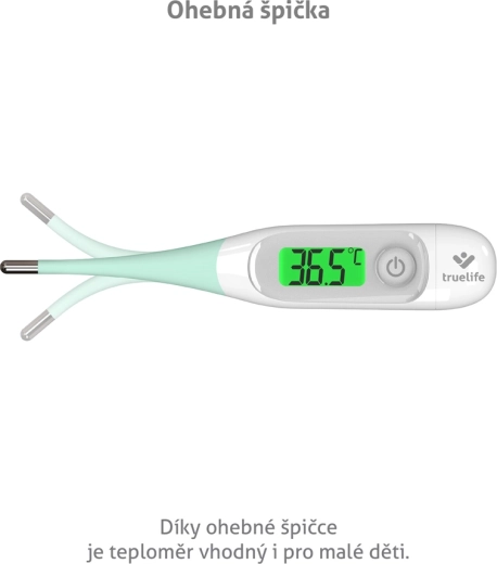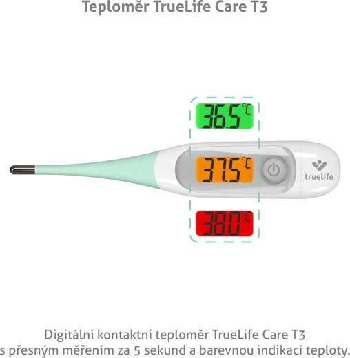 TrueLife Care T3 misura la temperatura in 5–10 s, dispone di retroilluminazione a 3 colori per una valutazione immediata, punta flessibile e memoria degli ultimi 10 rilevamenti. Misura anche la temperatura del bagnetto.