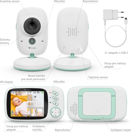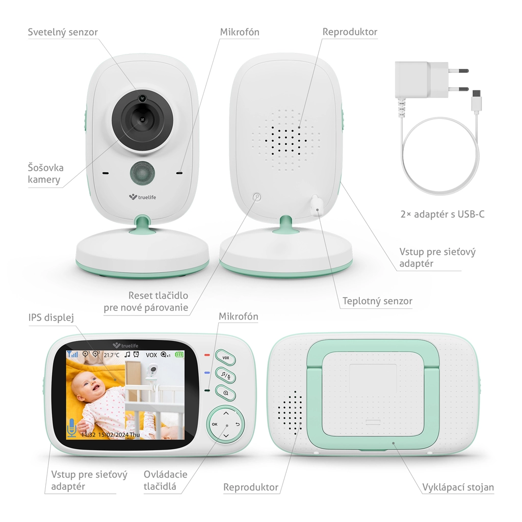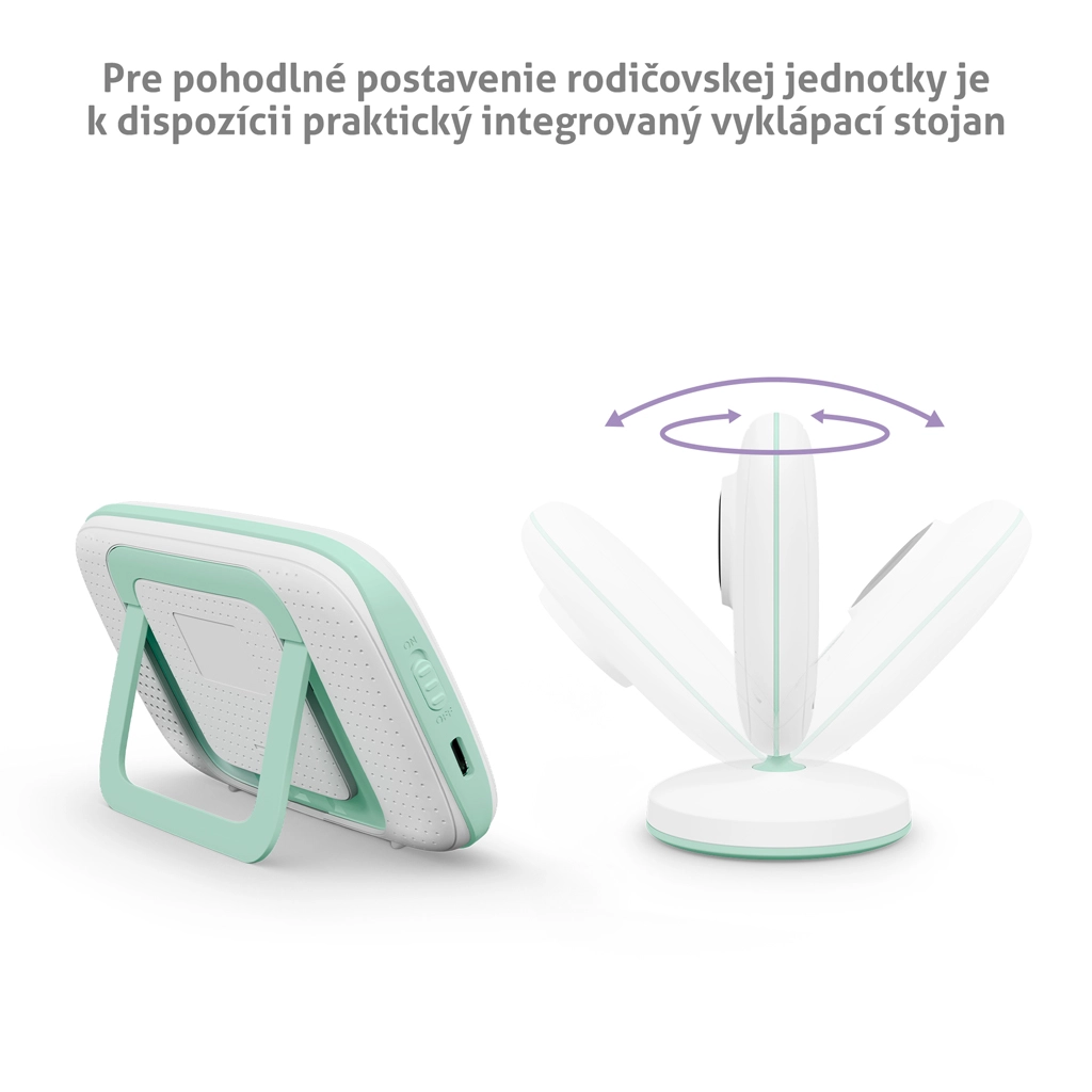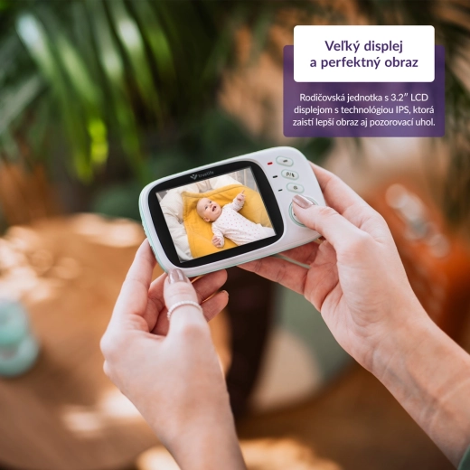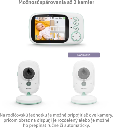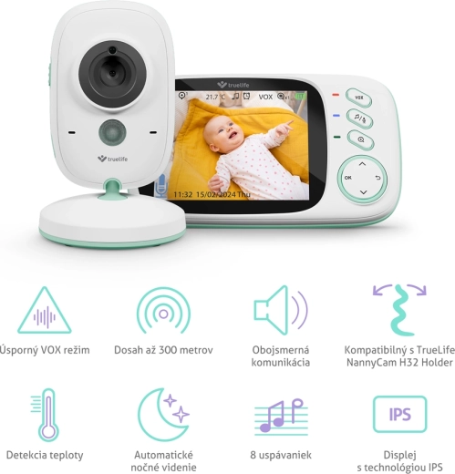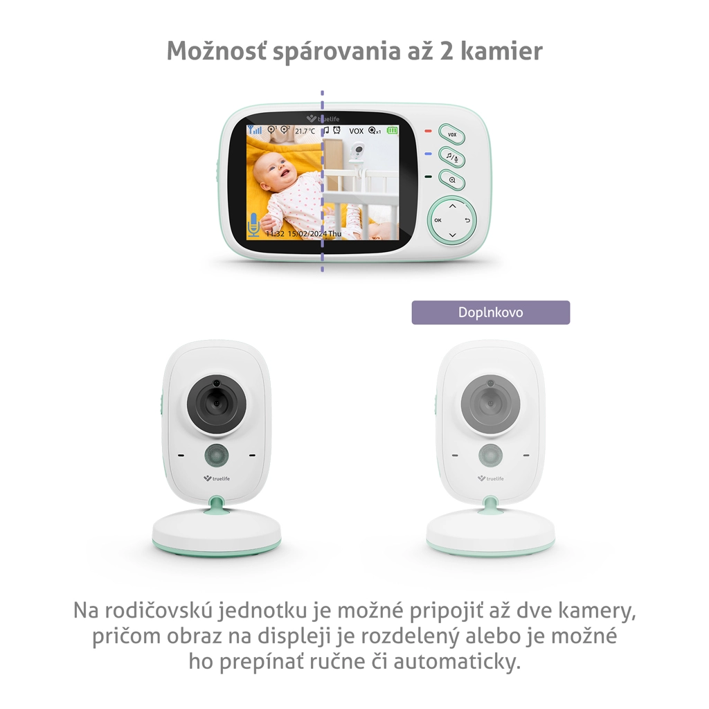 La pratica modalità VOX prolunga l’autonomia fino a 20 ore riattivando lo schermo solo al rilevamento di un suono. Il monitor misura anche la temperatura della stanza e avvisa in caso di variazioni. Con la solida portata fino a 300 m in campo aperto puoi muoverti liberamente in casa. Per una copertura maggiore è possibile associare fino a 2 telecamere e inclinare la telecamera secondo necessità; per il lettino è disponibile il supporto opzionale TrueLife NannyCam H32 Holder.