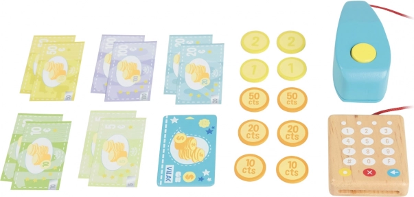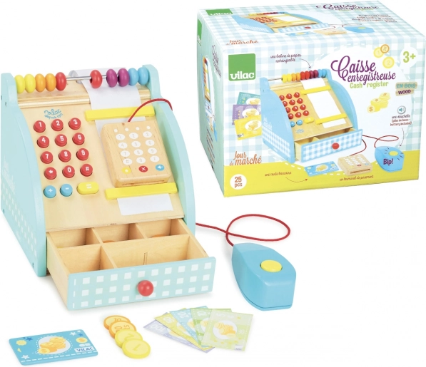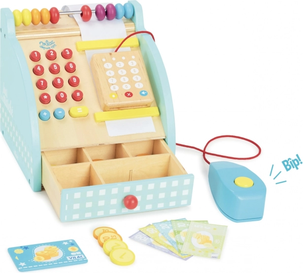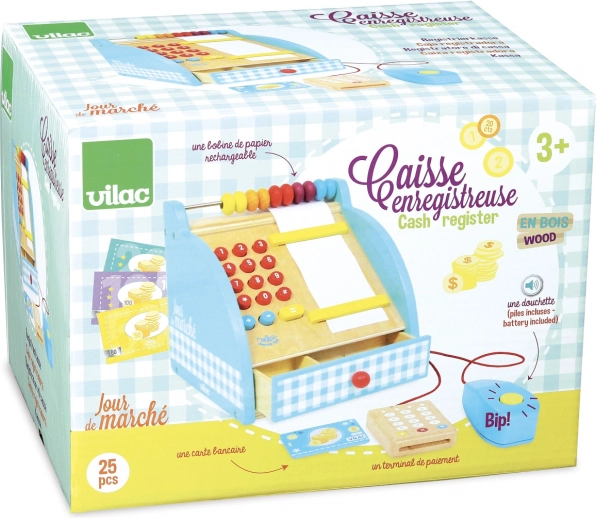 La stilosa cassa in legno VILAC farà felici piccoli commessi e commesse. Offre una tastiera numerica funzionante, un cassetto portamonete, un contatore e un terminale di pagamento. Inclusi anche banconote e monete e un classico pulsante sonoro, che rende il gioco più autentico.