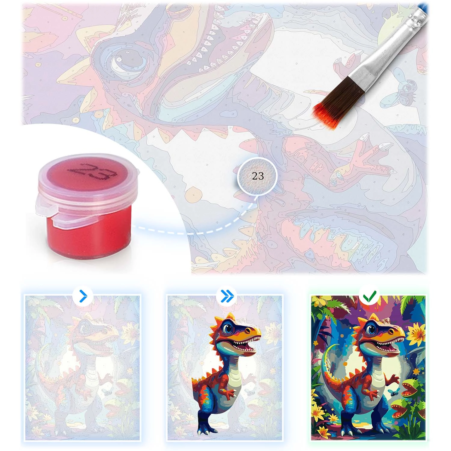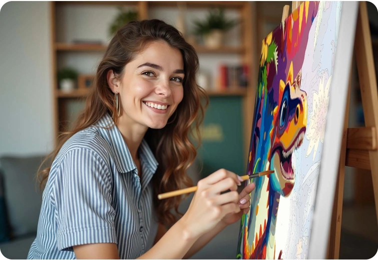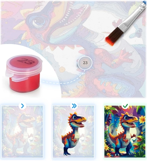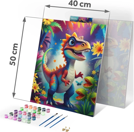 Scopri la gioia della creazione con il dipinto secondo i numeri 40 × 50 cm con motivo dinosauro. Il set include tutto il necessario: tela preparata su telaio, fino a 30 colori acrilici coprenti, 3 pennelli di varie dimensioni e ganci per l’appensione. Grazie alla pre-colorazione con linee sottili, anche i principianti riusciranno a dipingere facilmente e il risultato avrà colori intensi e copertura piena senza linee trasparenti.