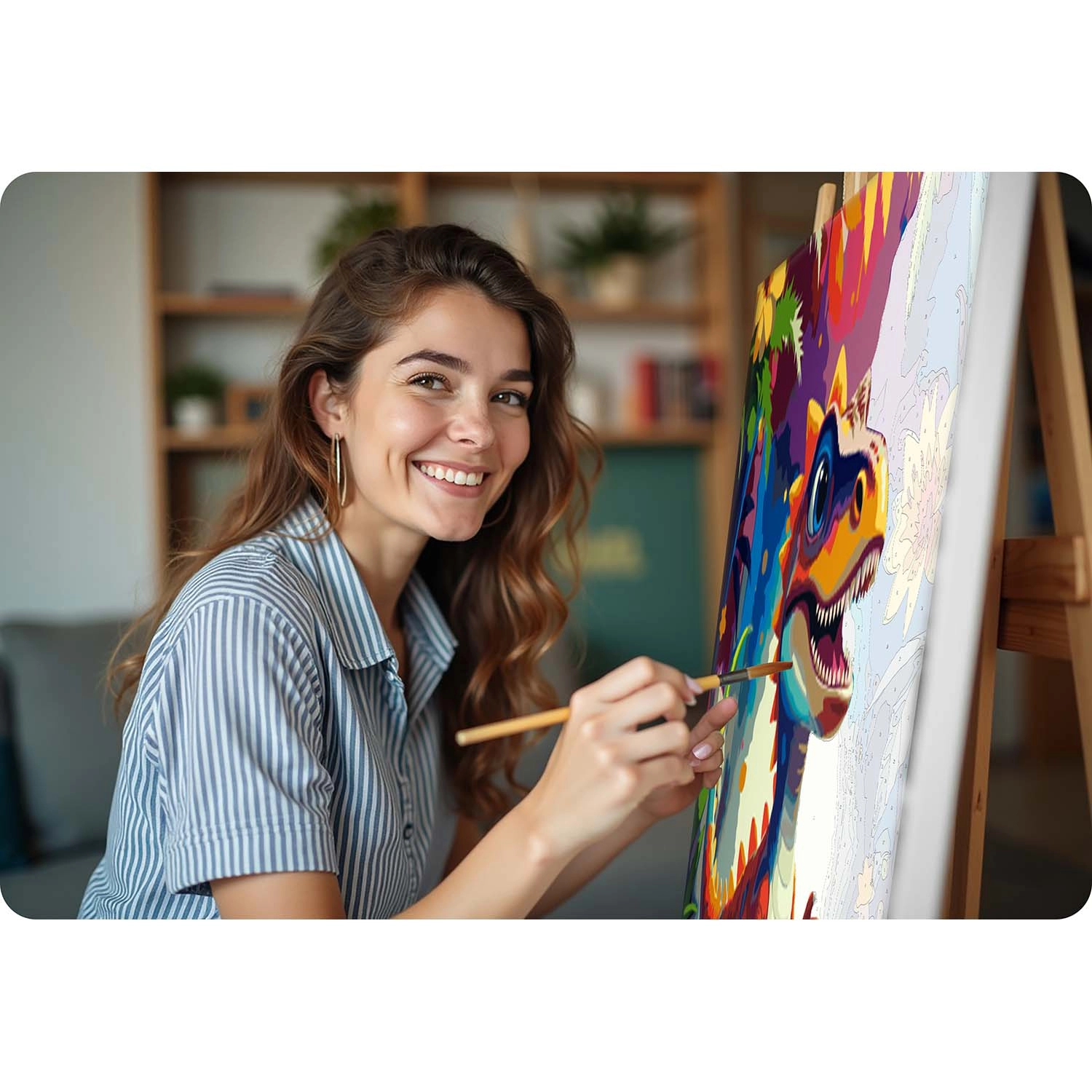 I colori acrilici già miscelati hanno coprenza eccellente e una consistenza piacevole: non è necessario diluirli. Tre pennelli (per grandi superfici, dettagli e linee precise) garantiscono massimo controllo su ogni pennellata. La tela è già tesa su un robusto telaio in legno, quindi dopo aver terminato basta fissare i ganci e appendere subito il quadro.