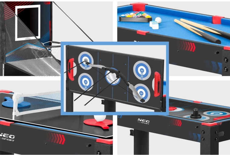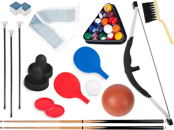 Nella confezione troverai: palle da biliardo e triangolo, 2 stecche (45 cm), gessetti, racchette e palline da ping pong, rete, striker e dischi per air hockey, canestro con protezione laterale, arco, 3 frecce e bersaglio.