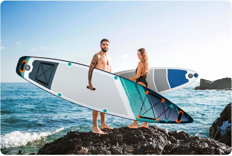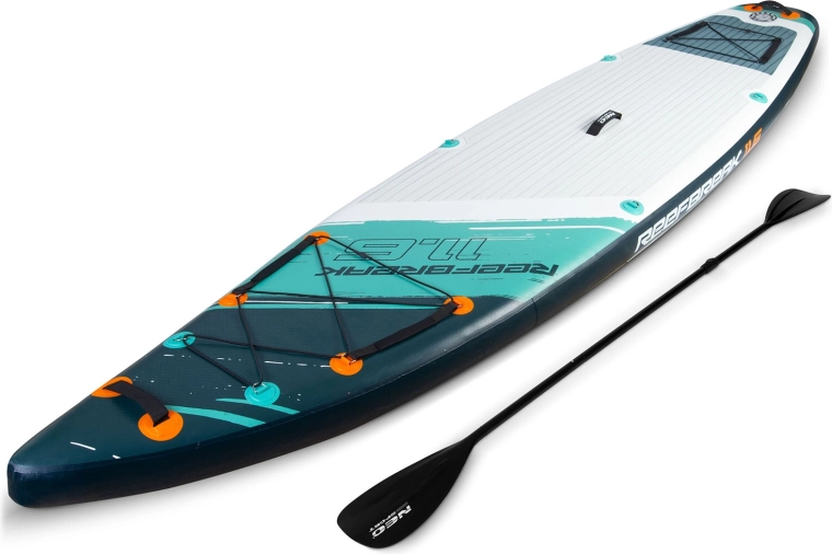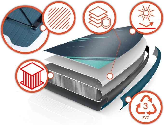 La costruzione Drop Stitch Light con PVC a triplo strato, rinforzo del bordo in carbonio e cuciture rinforzate unisce peso ridotto (circa 14 kg) ad alta rigidità e resistenza ai raggi UV. L’EVA antiscivolo è piacevole a piedi nudi, non scivola e assorbe gli urti. L’elastico anteriore cargo bungee trattiene in sicurezza zaino o asciugamano, la valvola a tenuta mantiene affidabilmente la pressione ed è incluso anche lo strumento per lo sfiato.