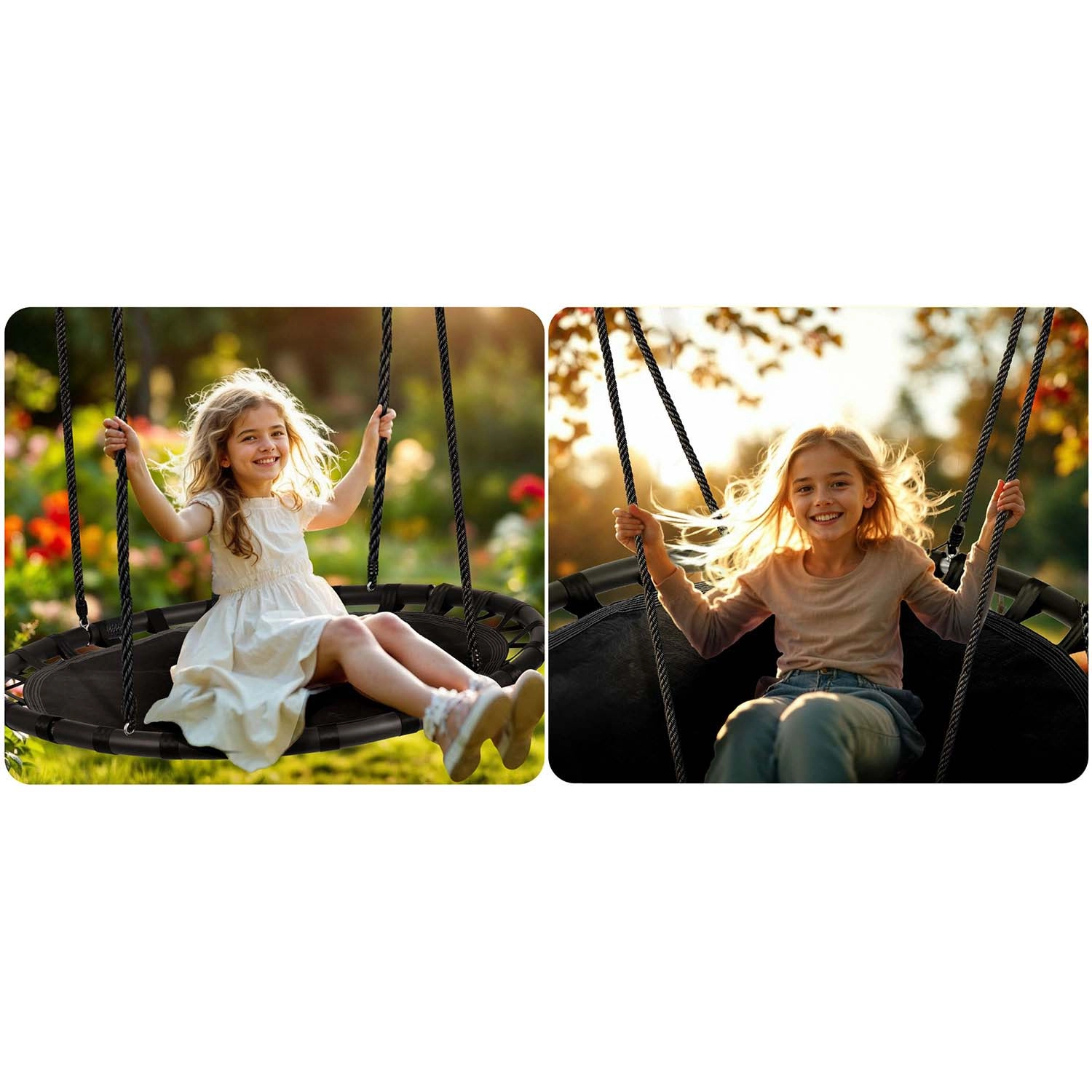 Grazie alle corde intrecciate robuste con regolazione fluida dell’altezza puoi adattare facilmente l’altalena all’altezza del bambino o al punto di fissaggio. Il diametro di 110 cm offre spazio sufficiente per sedersi o sdraiarsi e la portata di 150 kg permette di dondolare più bambini contemporaneamente.