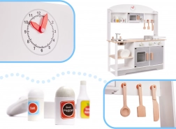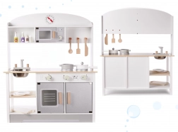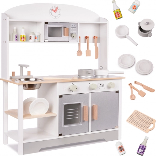 Elegante cucina giocattolo in legno MDF in colori neutri per ore di gioco creativo. Dispone di lavello in metallo estraibile, fornelli con manopole girevoli, forno con finestra e display, microonde e sgocciolatoio per stoviglie. Inclusi numerosi accessori in legno (pentola, padella, piattini, coltello, cucchiaio, spatola, barattoli delle spezie) e pratici ganci e ripiani per riporre tutto in ordine. Sicura, con superfici lisce e verniciata con colori atossici.