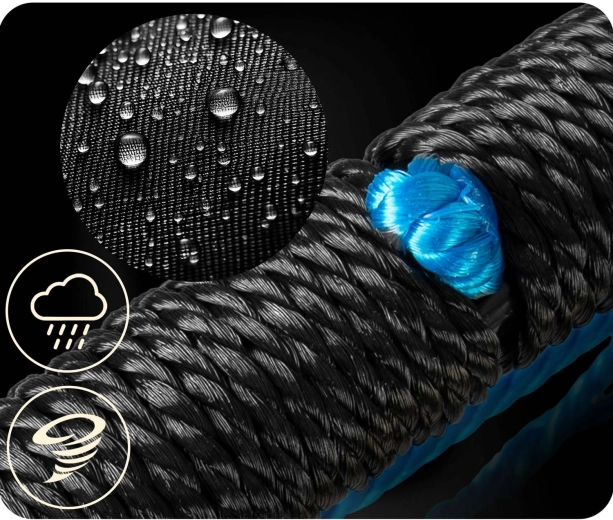 Il solido telaio in acciaio con rivestimento protettivo in PE e le robuste corde intrecciate garantiscono stabilità, lunga durata e resistenza all’acqua, ai raggi UV e all’usura.
