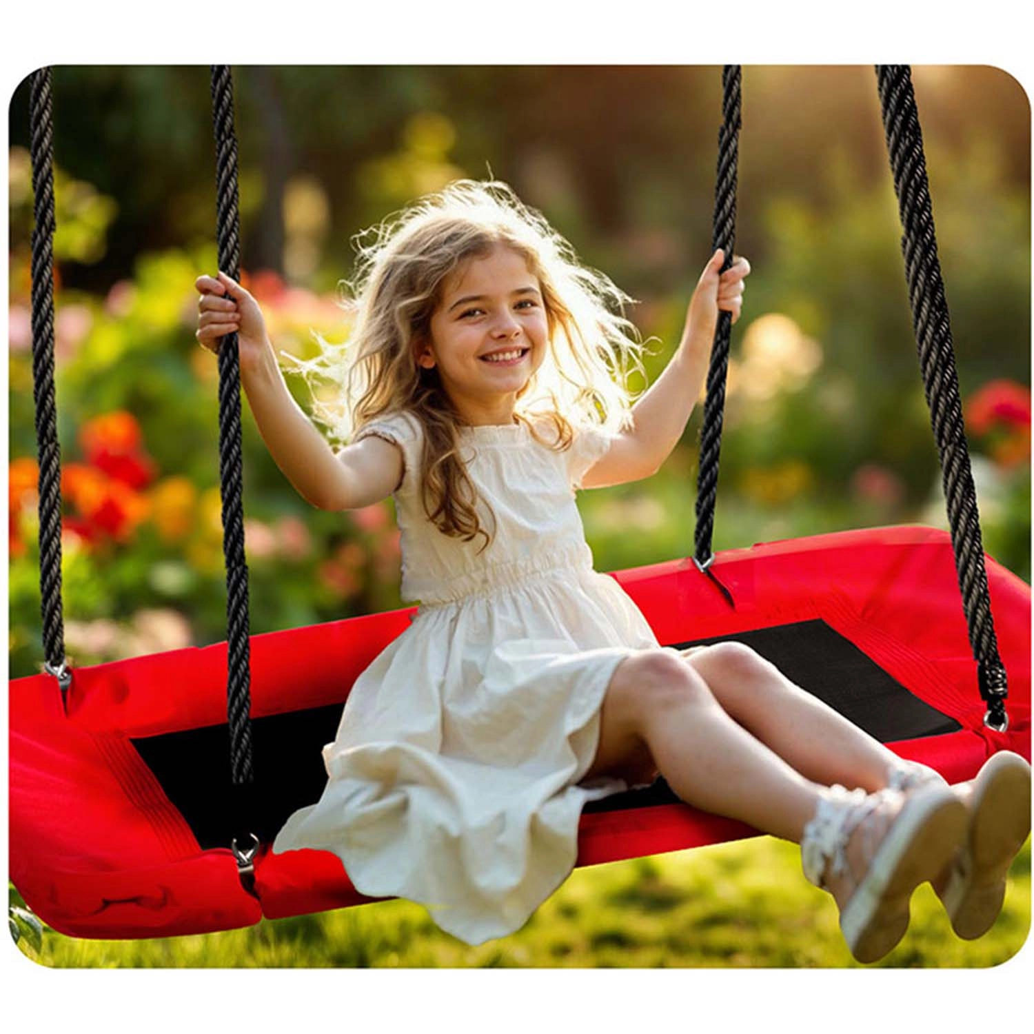 Grazie alle corde regolabili con lunghezza massima di 160 cm, puoi adattare facilmente l’altezza in base all’età e alla statura del bambino. Le corde intrecciate robuste e gli anelli metallici di qualità assicurano un fissaggio affidabile sia in casa che in giardino. La portata massima di 150 kg consente il divertimento condiviso di più bambini o un comodo relax sdraiati.