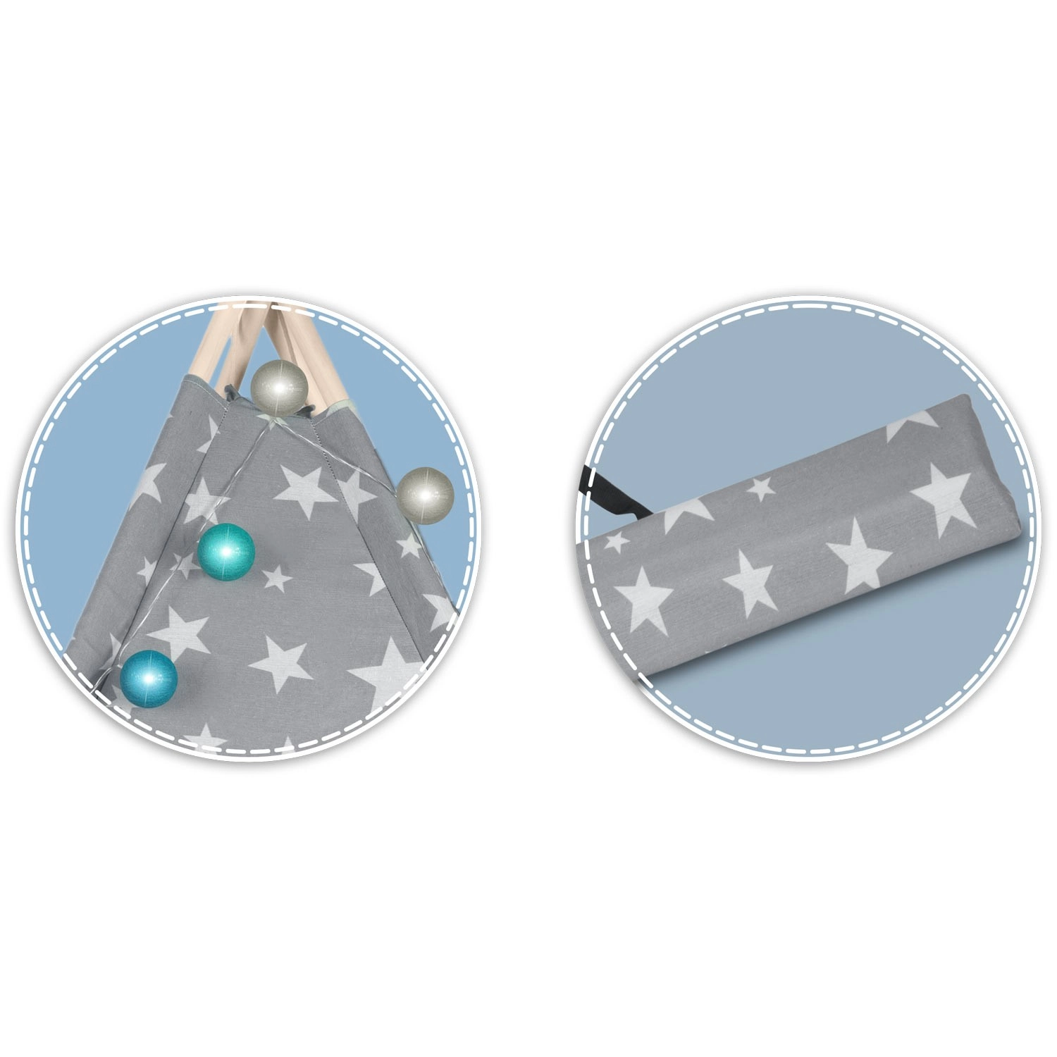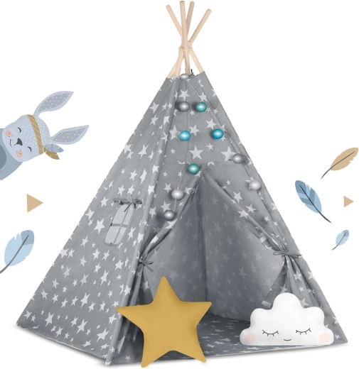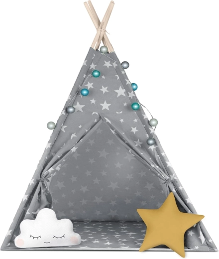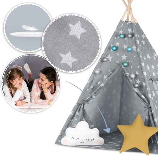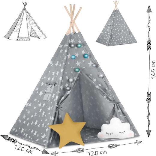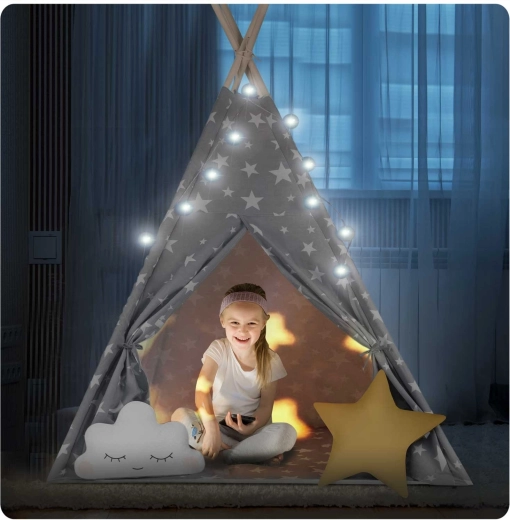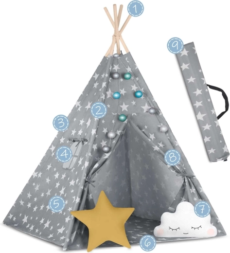 La confezione include tutto il necessario: 4 pali in pino, stabilizzatore per maggiore solidità, lucine LED (a batteria), fondo cucito, 2 morbidi cuscini a forma di nuvola e stella, finestrella con tendina e comoda sacca per il trasporto. Il teepee si monta e si sposta facilmente – perfetto per la cameretta, l’area giochi e il giardino all’ombra.