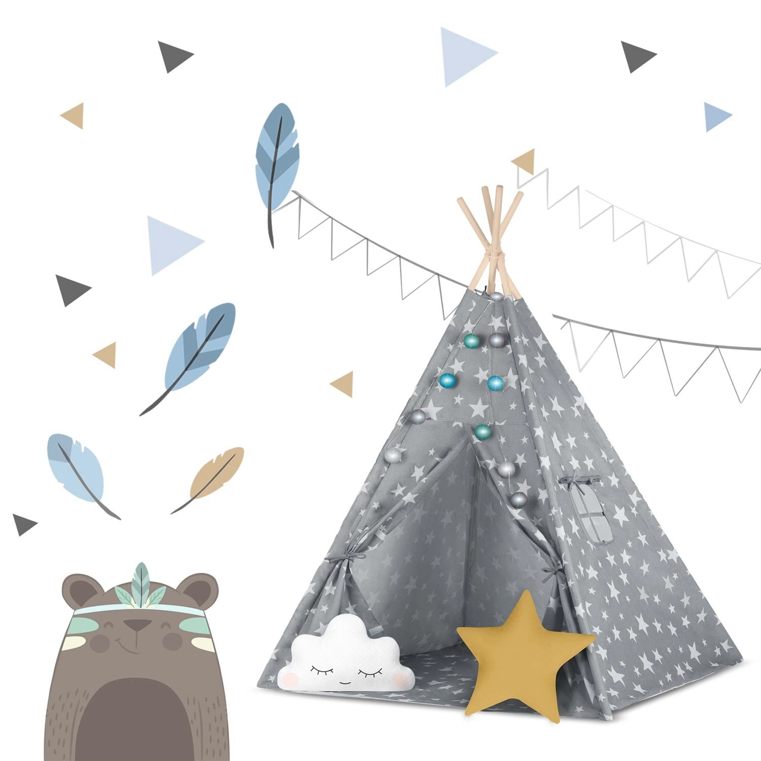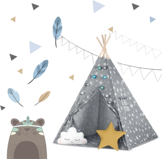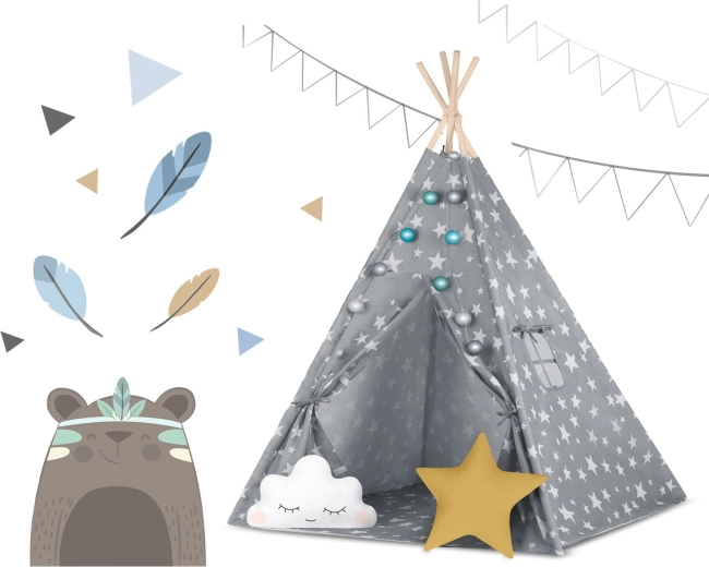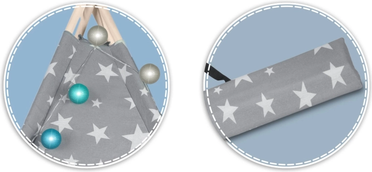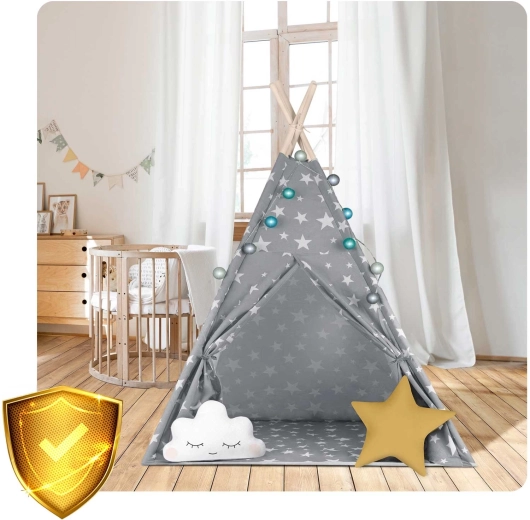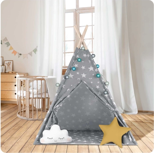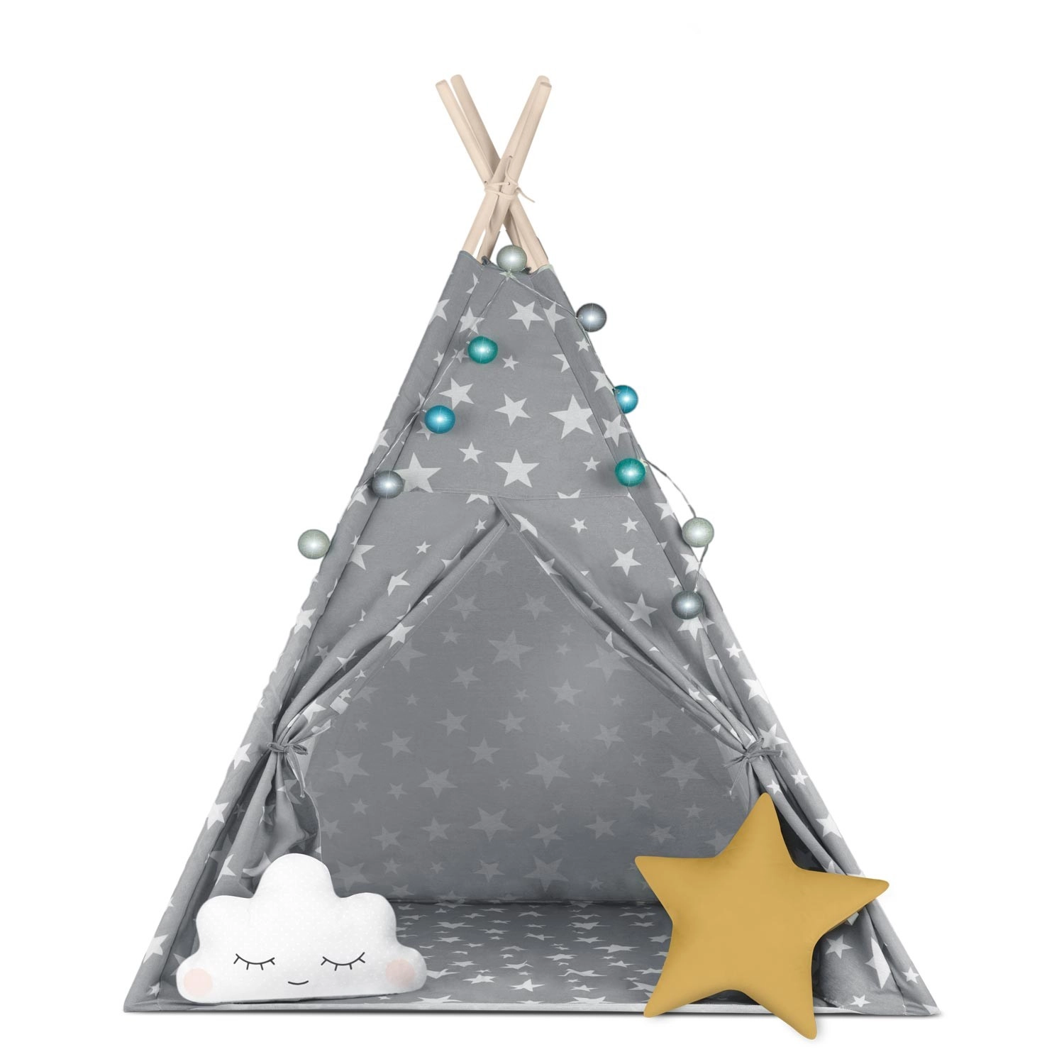 La confezione include tutto il necessario: 4 pali in pino, stabilizzatore per maggiore solidità, lucine LED (a batteria), fondo cucito, 2 morbidi cuscini a forma di nuvola e stella, finestrella con tendina e comoda sacca per il trasporto. Il teepee si monta e si sposta facilmente – perfetto per la cameretta, l’area giochi e il giardino all’ombra.