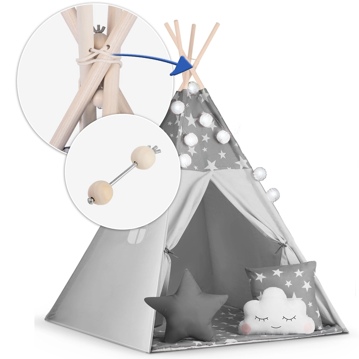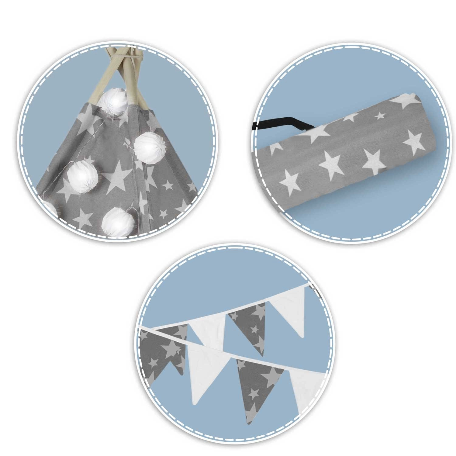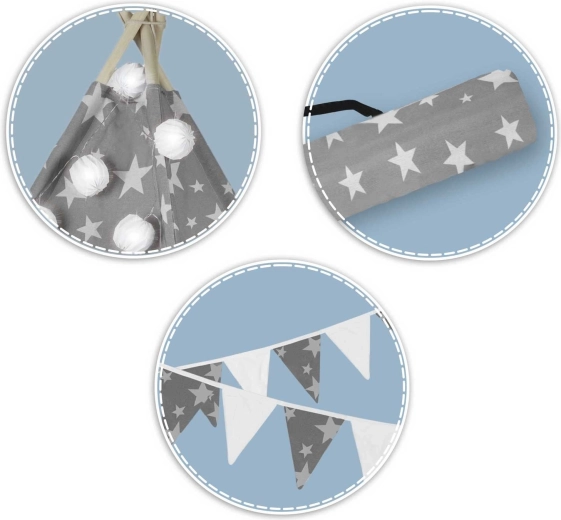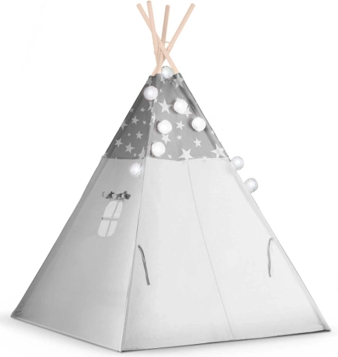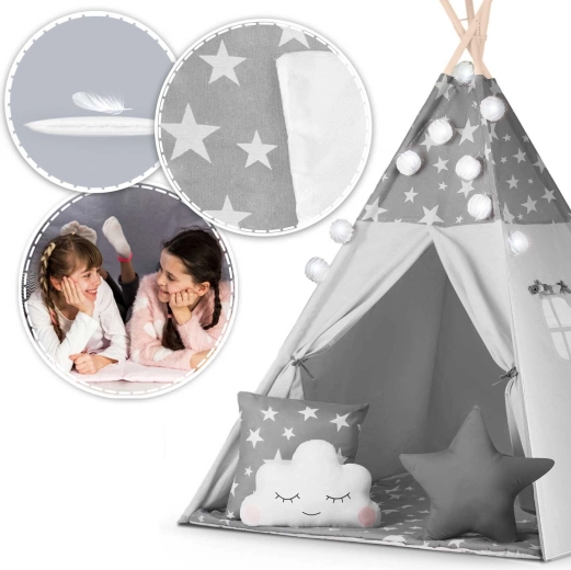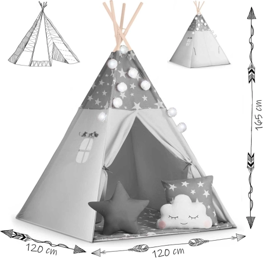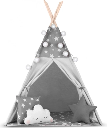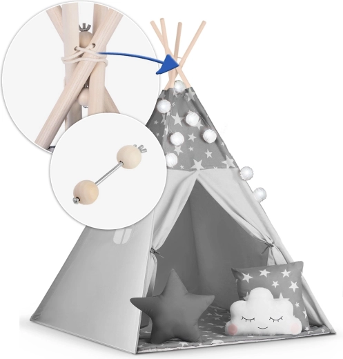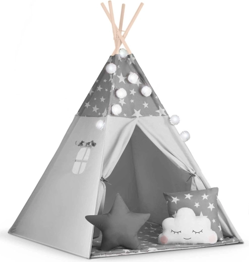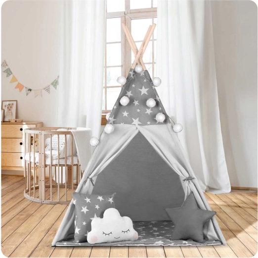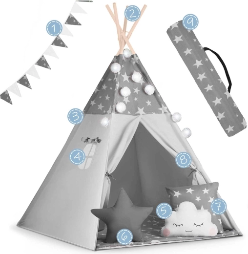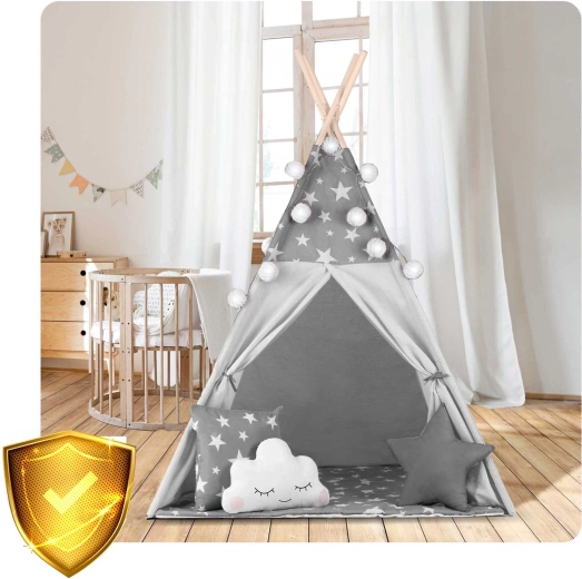 Create per i bambini il loro angolo accogliente con il teepee NUKIDO. Questa tenda di stile, in delicato grigio con stelline, è realizzata in cotone premium, ha una struttura in legno stabile con stabilizzatore incluso e comprende un morbido tappetino isolante, 3 cuscinetti, ghirlanda, lucine e sacca per il trasporto. Si monta facilmente, è ben ventilata ed è ideale per giocare, leggere e rilassarsi in casa o in giardino.
