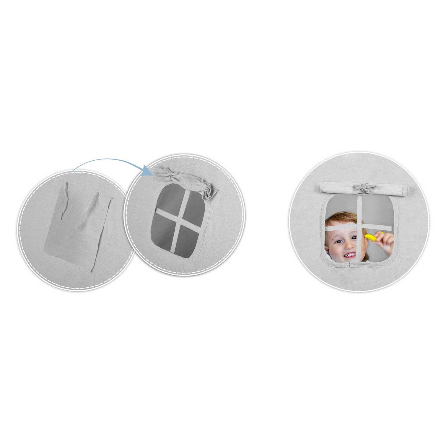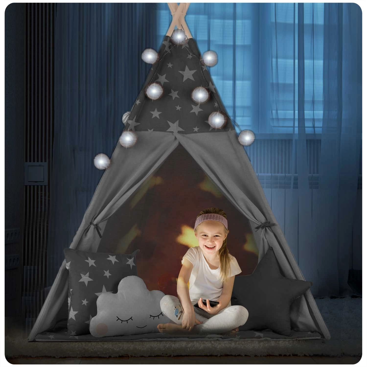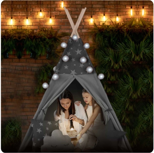Per il massimo comfort, la confezione include un tappetino isolante imbottito con finitura antiscivolo e tre cuscinetti decorativi. L’atmosfera è assicurata dalle lucine LED e dalla ghirlanda, mentre la finestrina arrotolabile e gli ingressi con laccetti permettono di giocare con luce e spazio. Una volta chiuso, il teepee occupa pochissimo e si trasporta facilmente nella sacca inclusa.