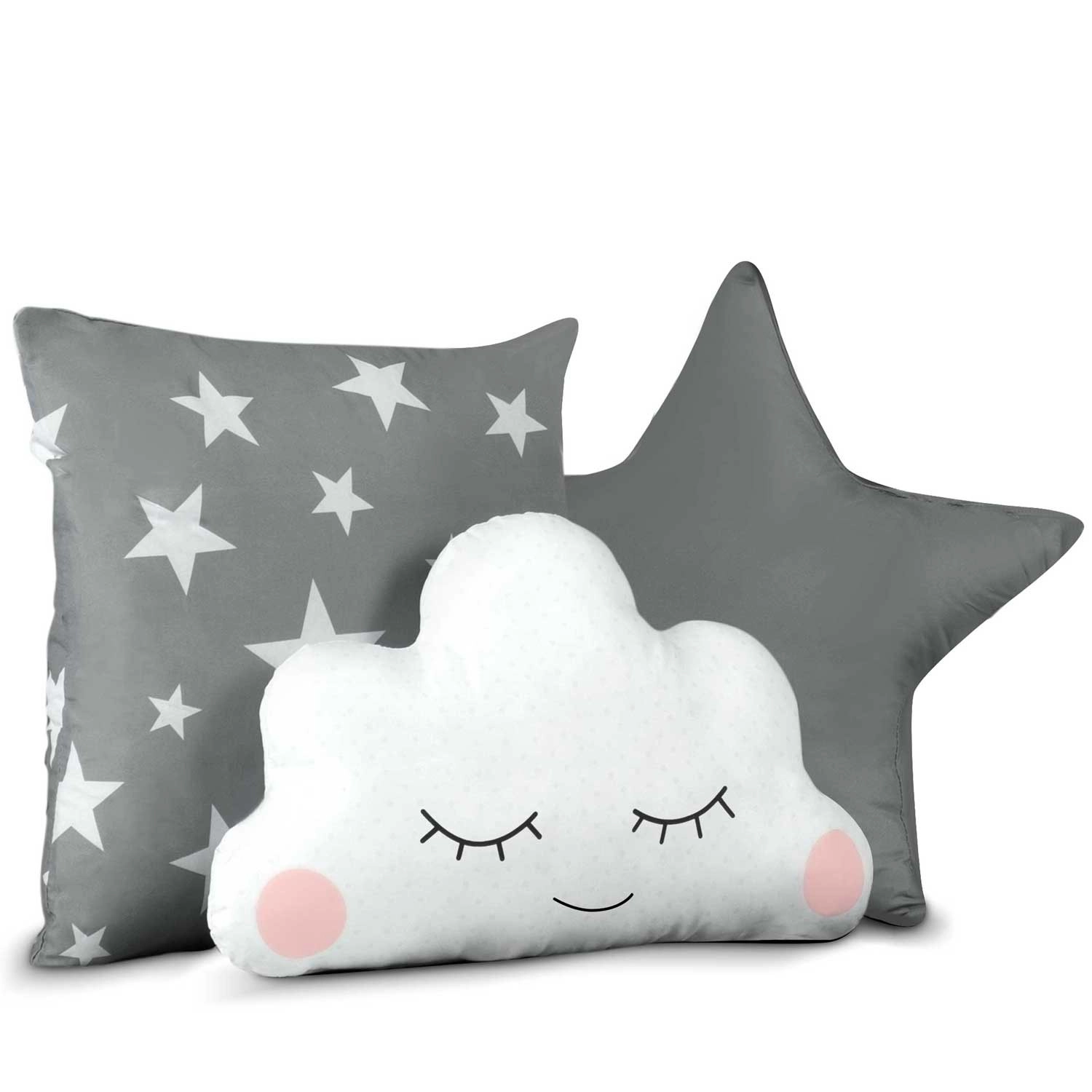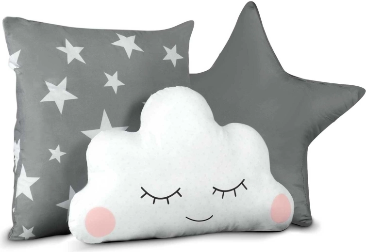 Nella confezione trovi un tappetino imbottito, 3 cuscinetti, lucine LED, ghirlanda e pratica sacca: tutto coordinato in grigio con stelline.