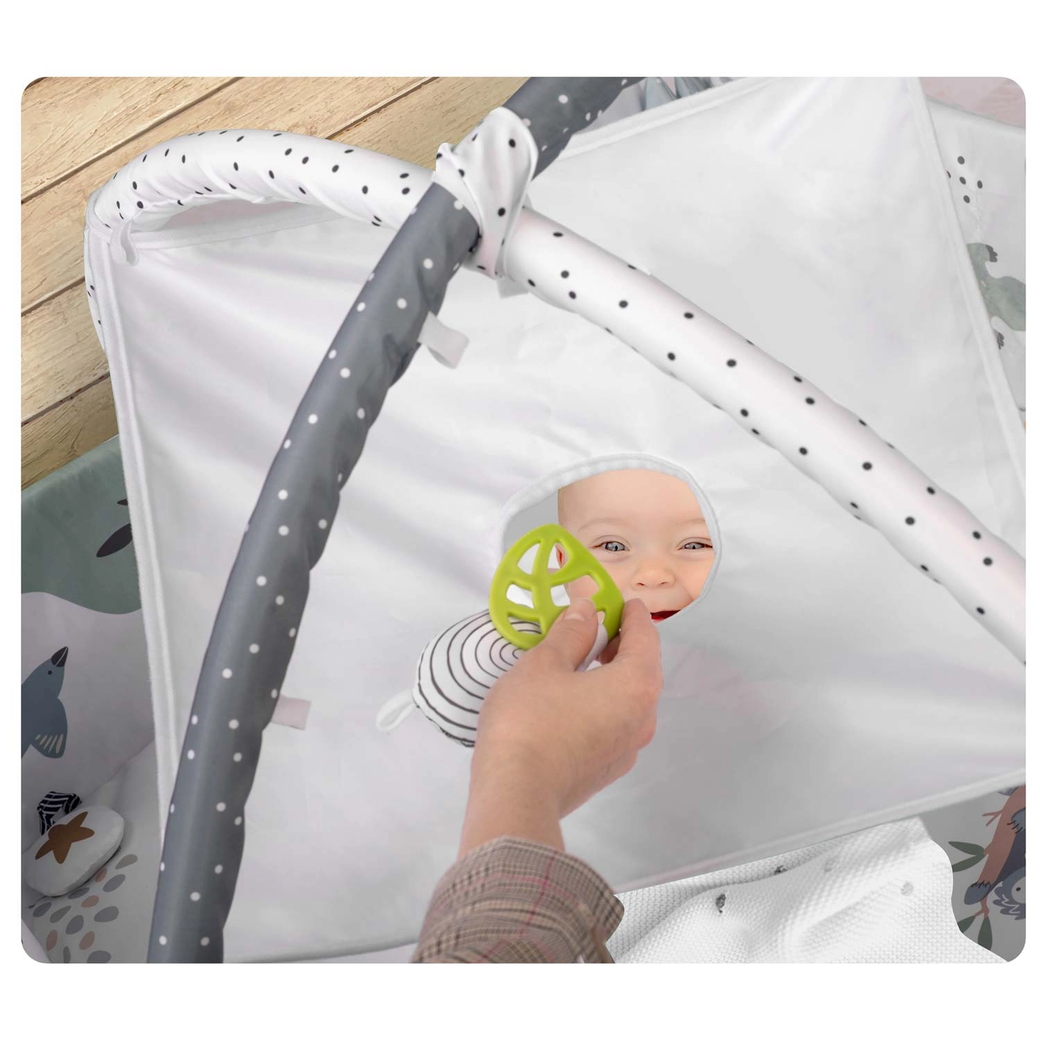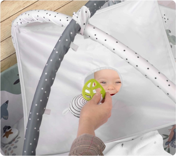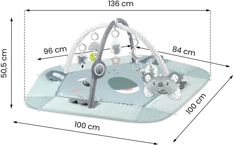 Le generose dimensioni 136 × 136 cm offrono spazio sufficiente anche per gemelli. Il tappeto ha sponde sollevabili con velcro per creare un morbido bordo protettivo, archetti regolabili e rimovibili e giochi (sonaglini, elementi fruscianti, squeaker, specchio in materiale infrangibile). Tre taschine sensoriali per immagini supportano la stimolazione visiva e lo sviluppo cognitivo.