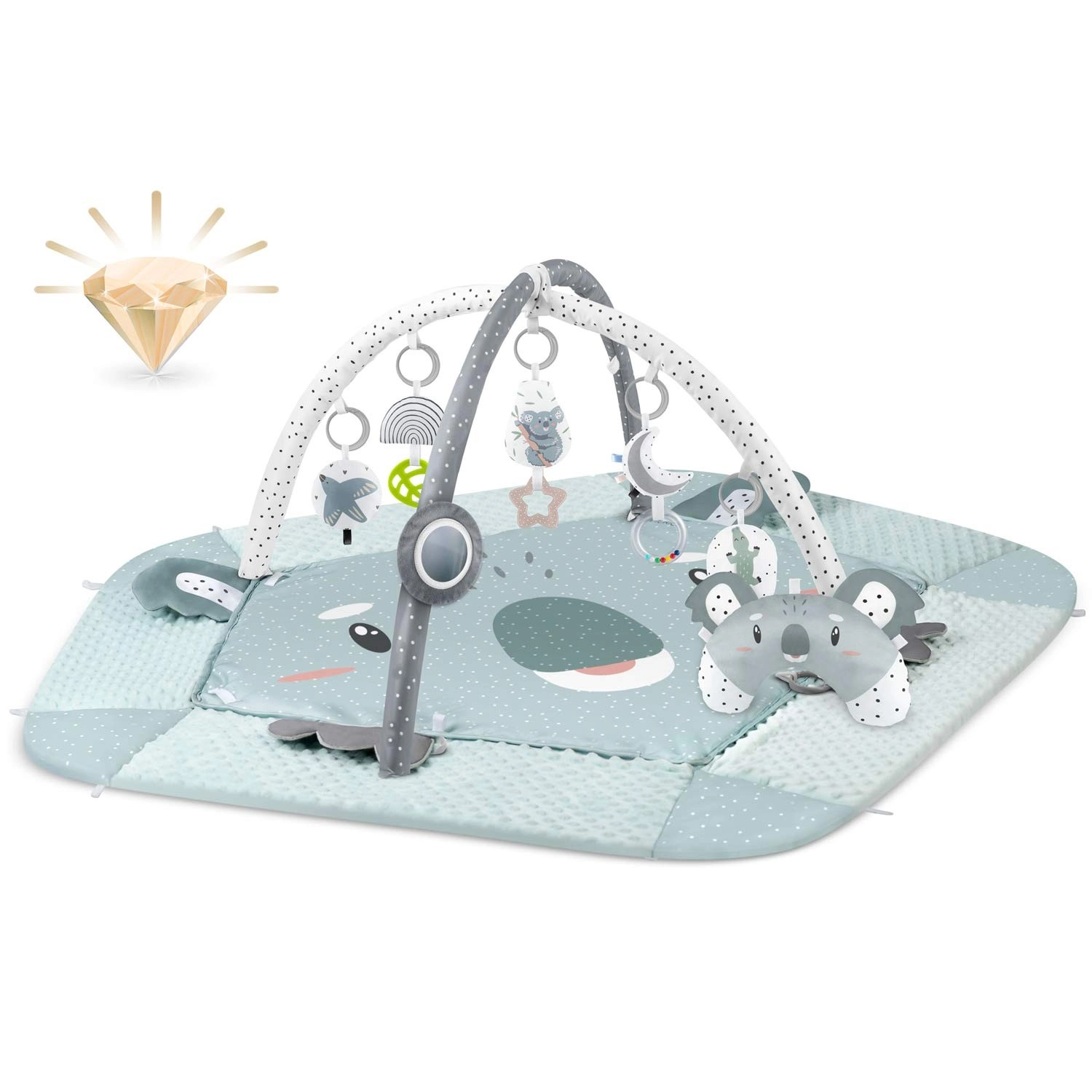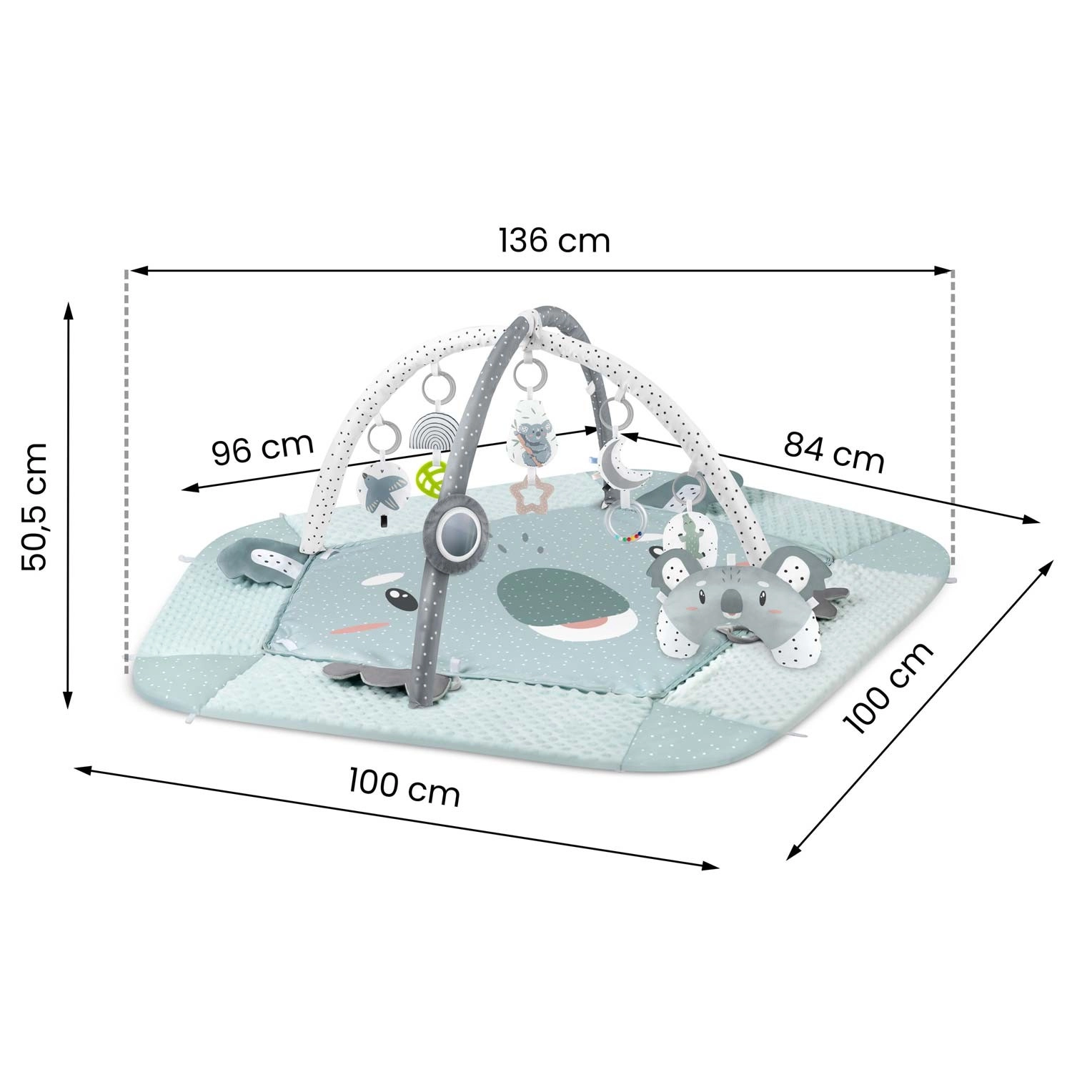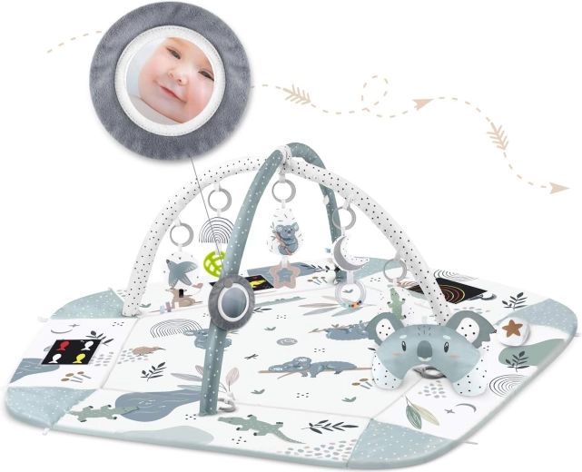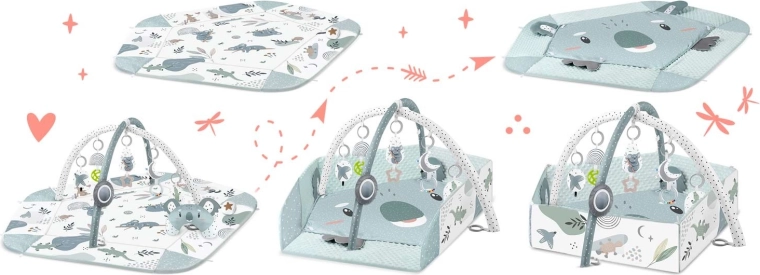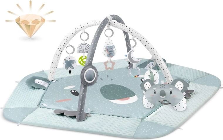 Scopri il tappeto gioco per neonati con motivo a koala, che unisce una zona di gioco sicura al supporto dello sviluppo motorio fin dai primi giorni. Il tappeto è double-face, ha sponde rialzabili, chiusura rapida e fino a 7 giochi multifunzionali inclusi il cuscinetto per il tummy time e uno speciale tappetino “CU‑CU” peekaboo. Il morbido materiale minky è soffice e facile da pulire. Conforme ai rigorosi standard di sicurezza europei CE, EN71‑1/2/3.