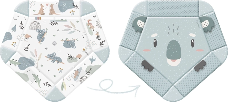 Grazie al design double-face e alla piegatura facile, è ideale a casa e in viaggio. La superficie morbida in minky e poliestere è piacevole al tatto e semplice da mantenere. Inclusi anche il cuscinetto per il tummy time con orecchiette fruscianti della koala e lo speciale tappetino peekaboo “CU‑CU” per il gioco del cucù, che favorisce la comprensione della permanenza dell’oggetto.