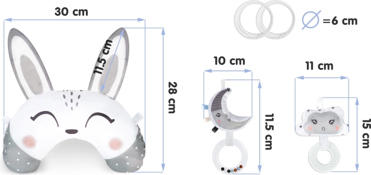 - Supporto per tummy time e seduta, stimolazione sensoriale (fruscio, sonaglio), sollievo durante la dentizione