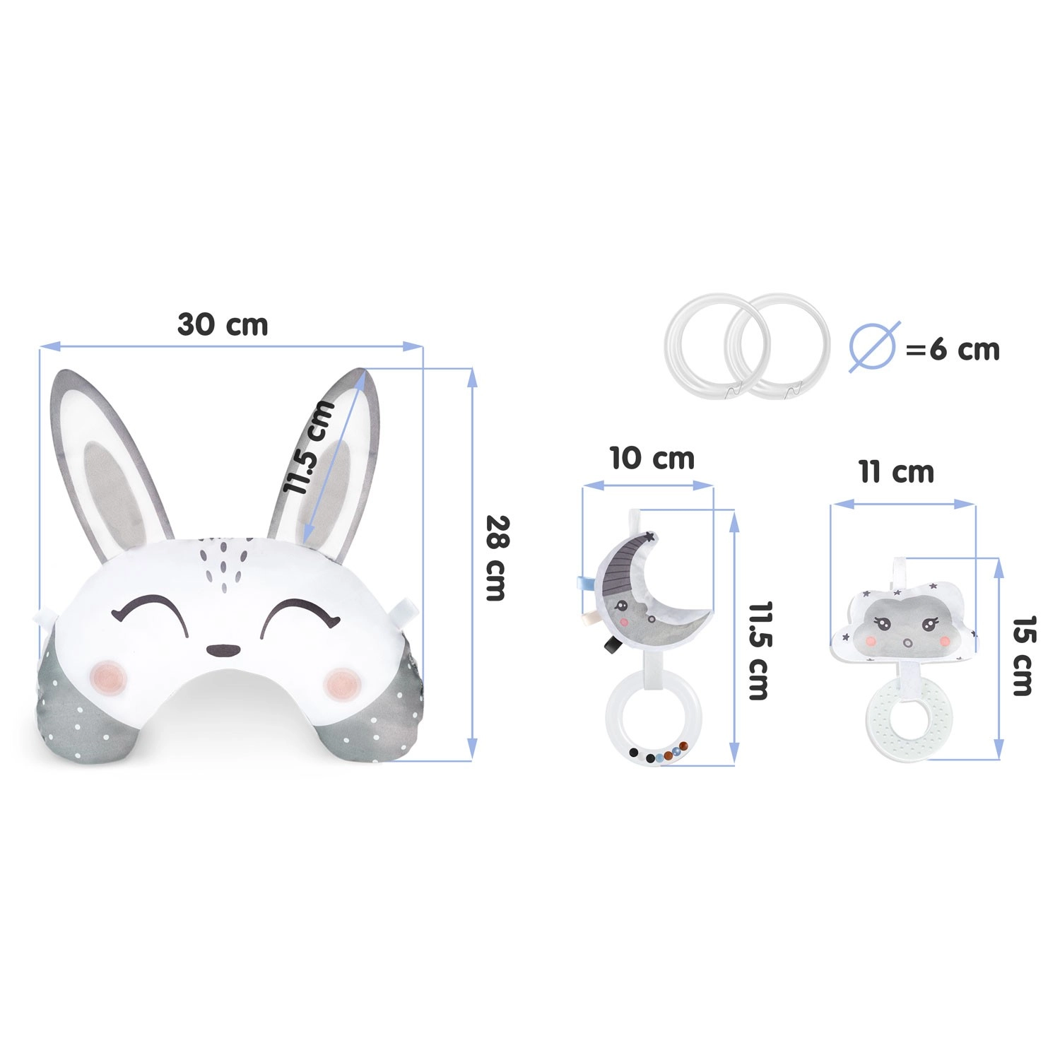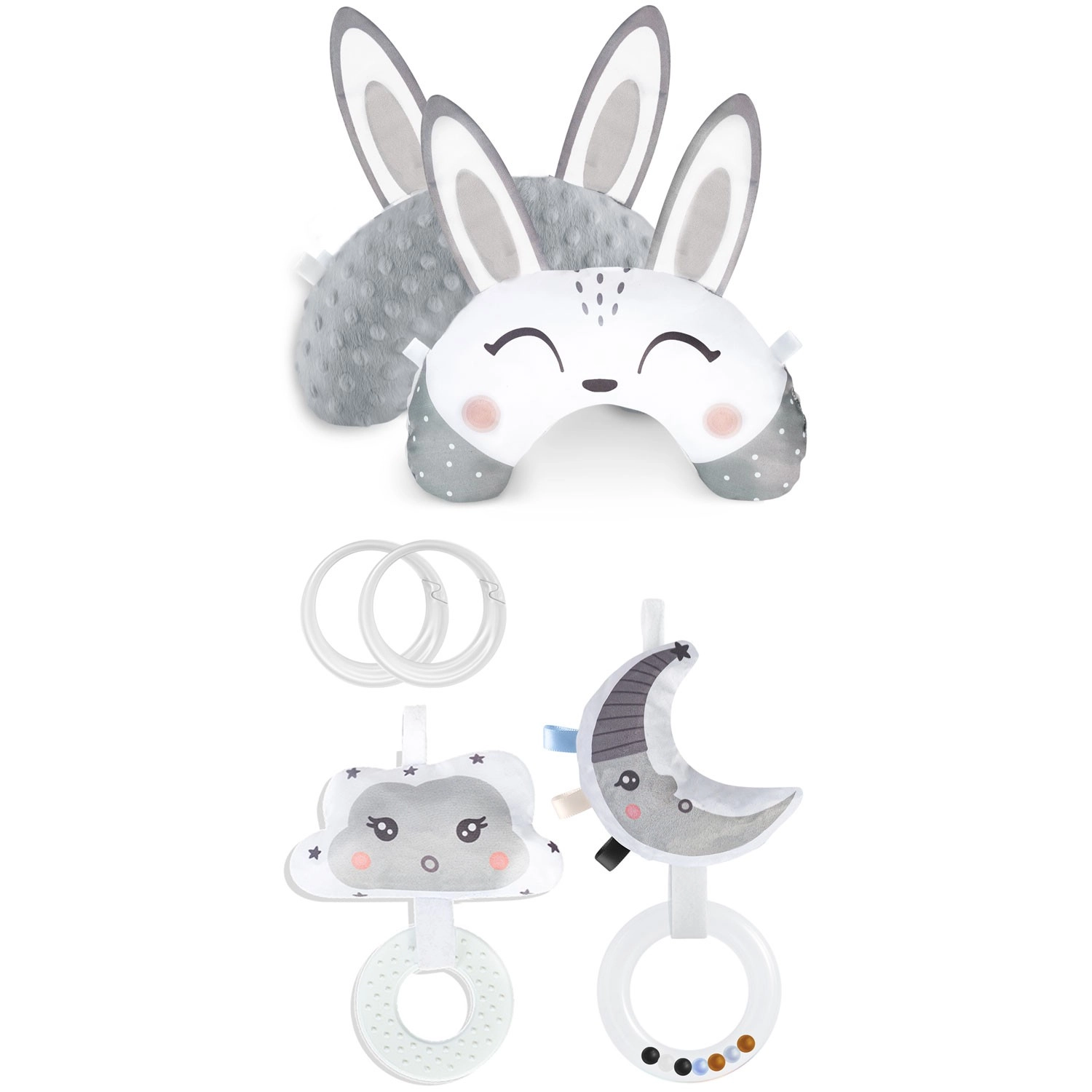La nuvoletta frusciante con massaggiagengive e la mezzaluna con sonaglino stimolano udito, tatto e vista. Gli anelli in plastica permettono di agganciare e alternare facilmente i giochi secondo le esigenze.