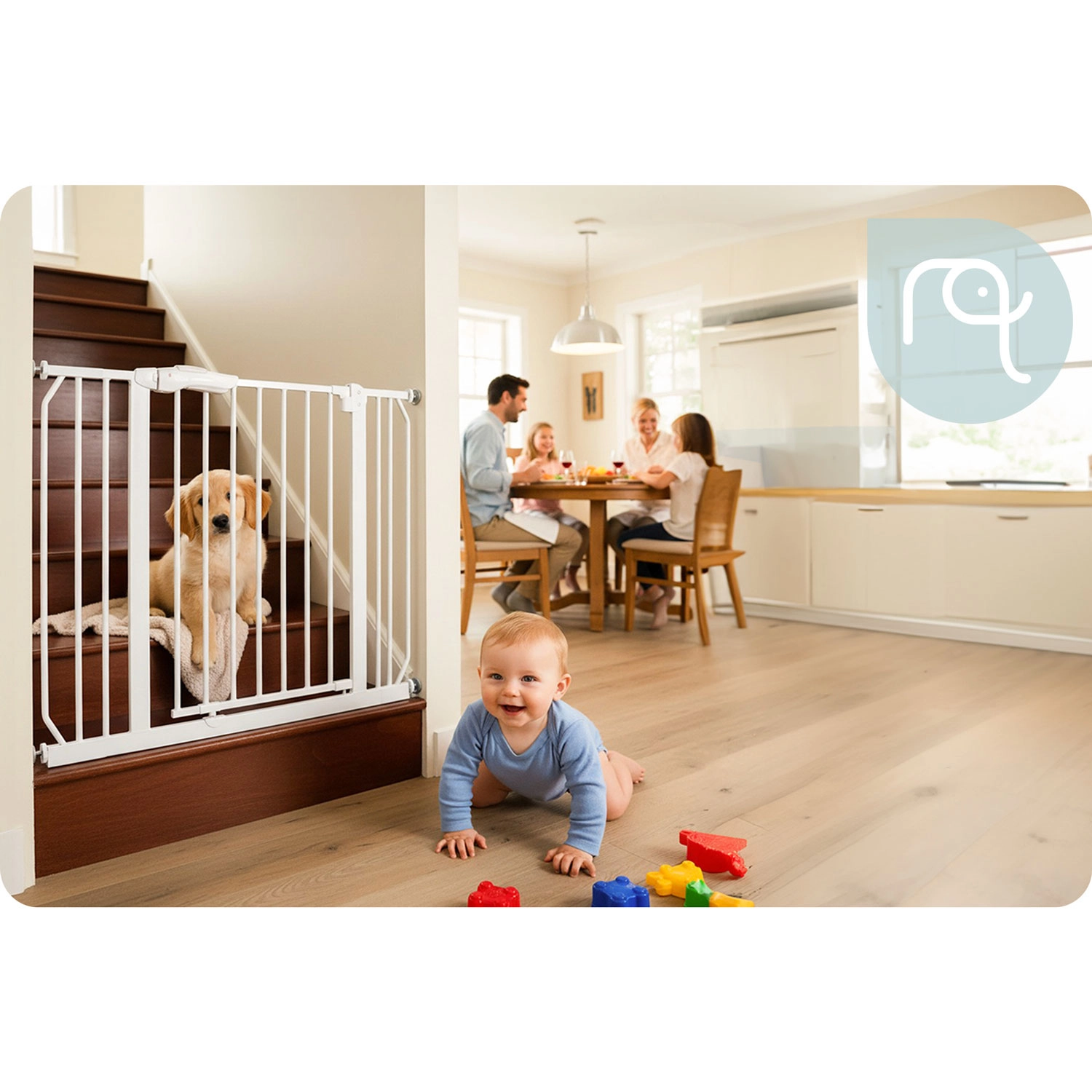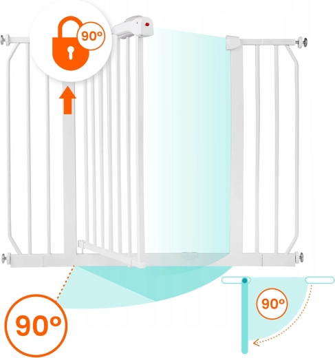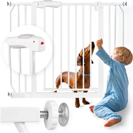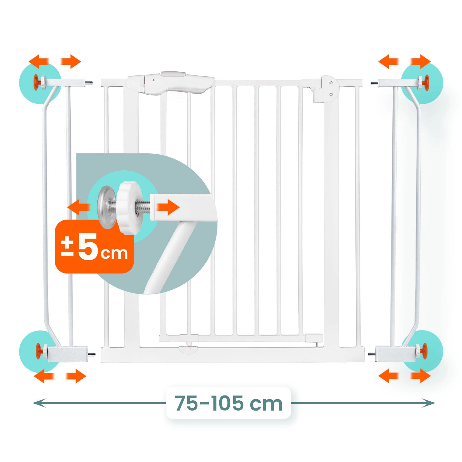 La confezione include prolunghe e regolatori di larghezza, con cui adattare facilmente la barriera a passaggi di 75–105 cm. Ideale per porte e per l’inizio o la fine delle scale.