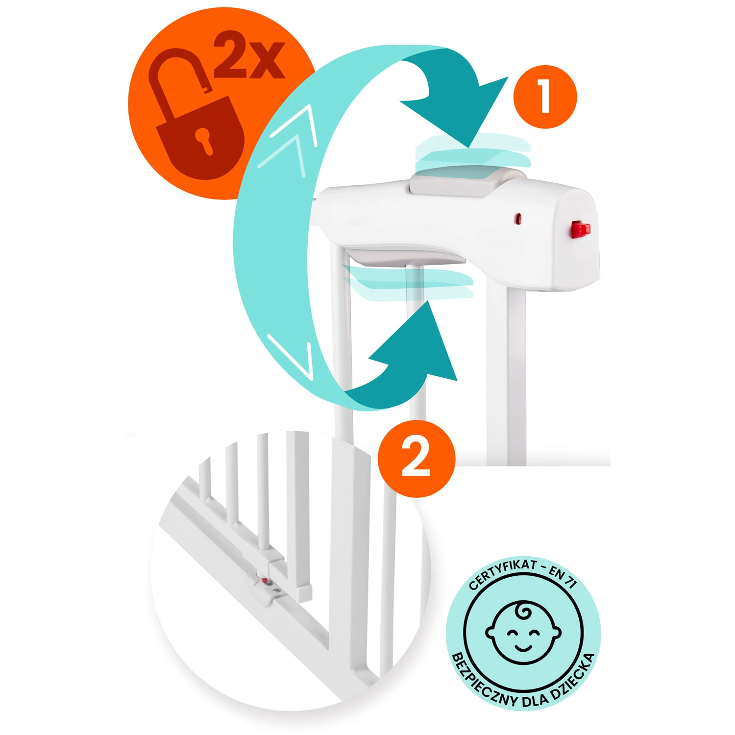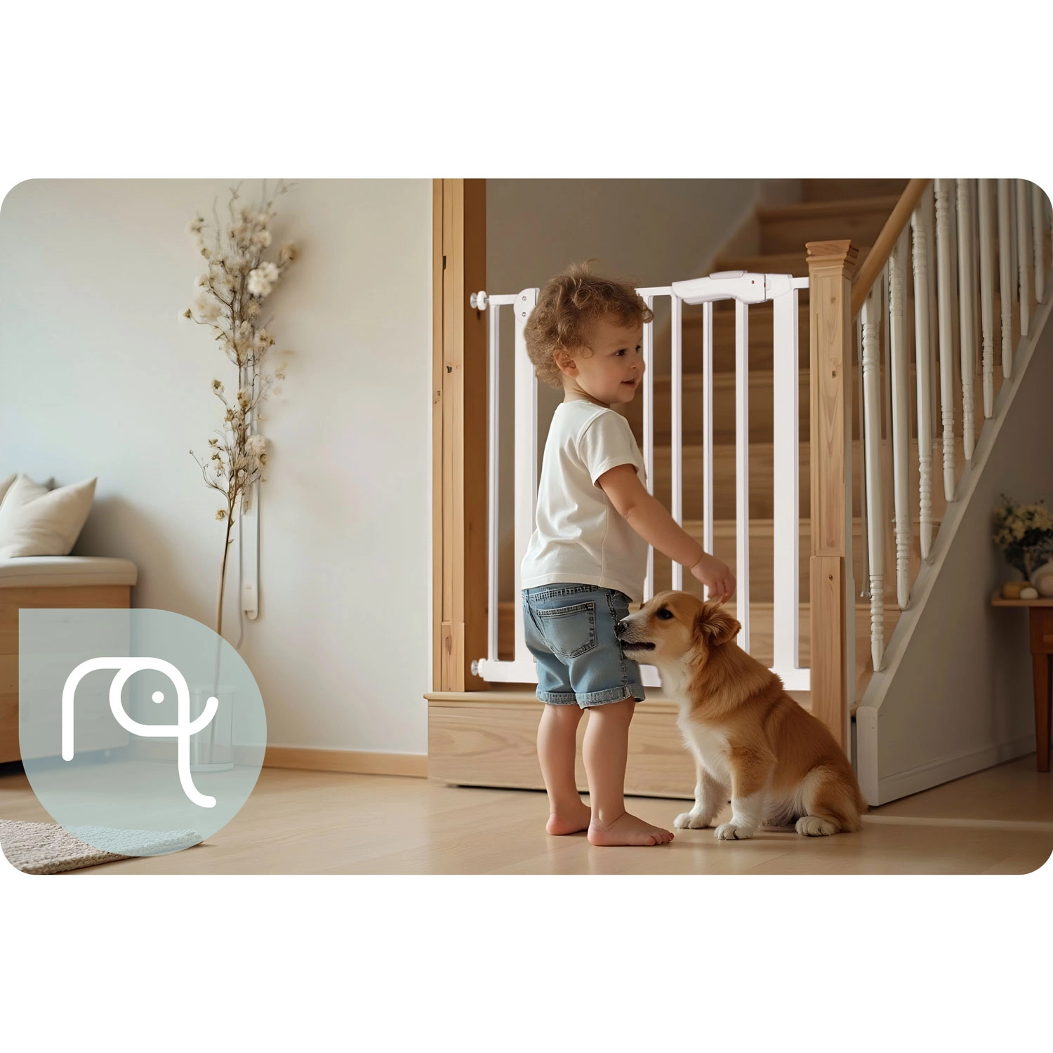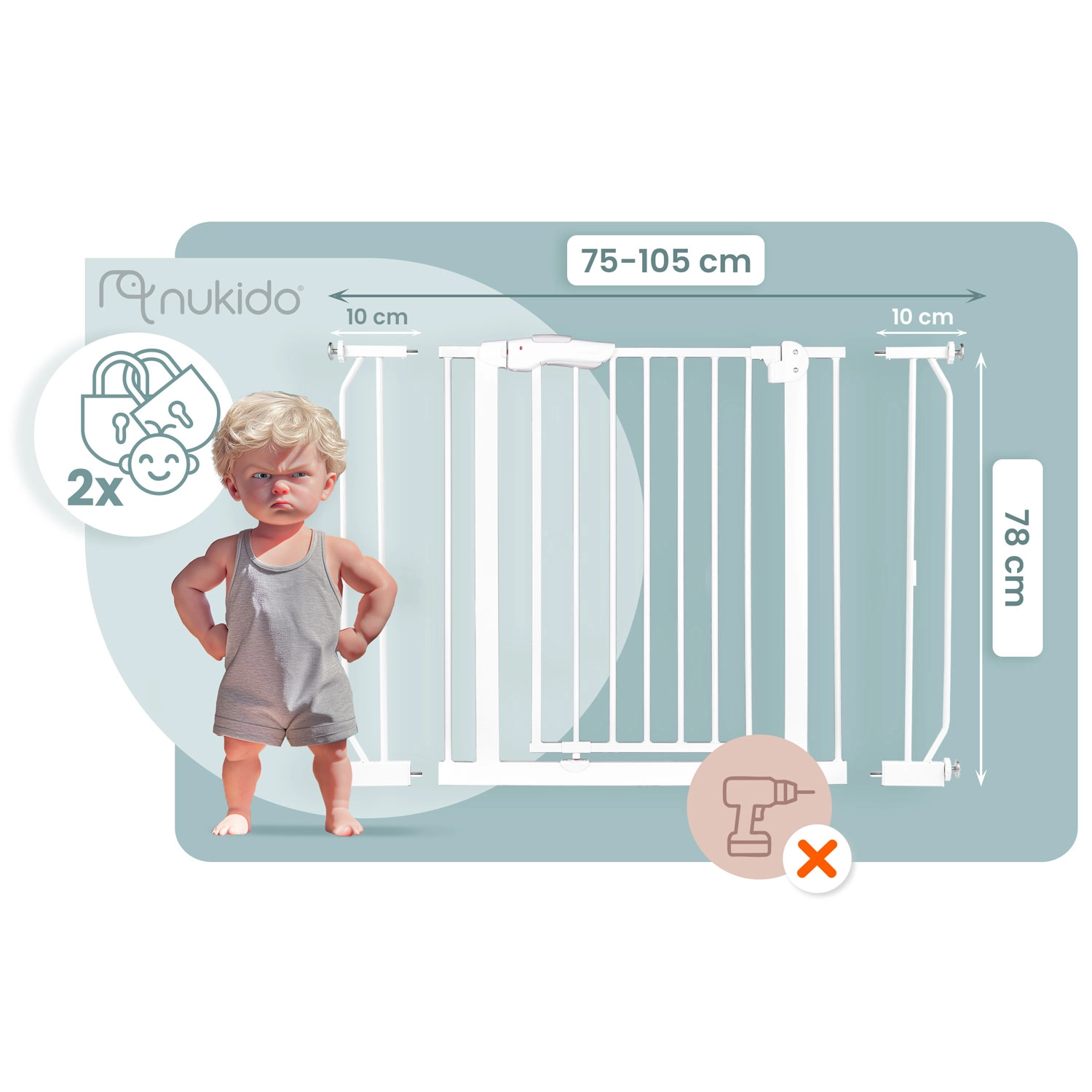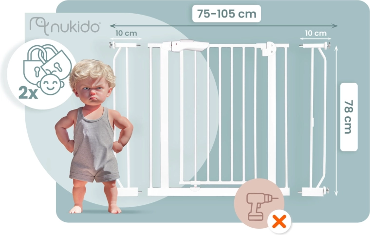 La barriera di sicurezza NUKIDO, nel raffinato colore bianco, si adatta alla maggior parte degli interni e grazie al fissaggio a pressione si installa in pochi minuti, senza danneggiare pareti o stipiti. La costruzione in metallo robusto e la certificazione EN 1930:2011 garantiscono una protezione affidabile per bambini e piccoli animali domestici.