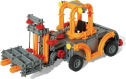 Assembla il popolare carrello elevatore. Le forche sollevano facilmente la “pallet”, il montante può essere orientato e, con l’aiuto di una manovella con cordino (non inclusi), è possibile simulare l’abbassamento e il sollevamento del carico.
