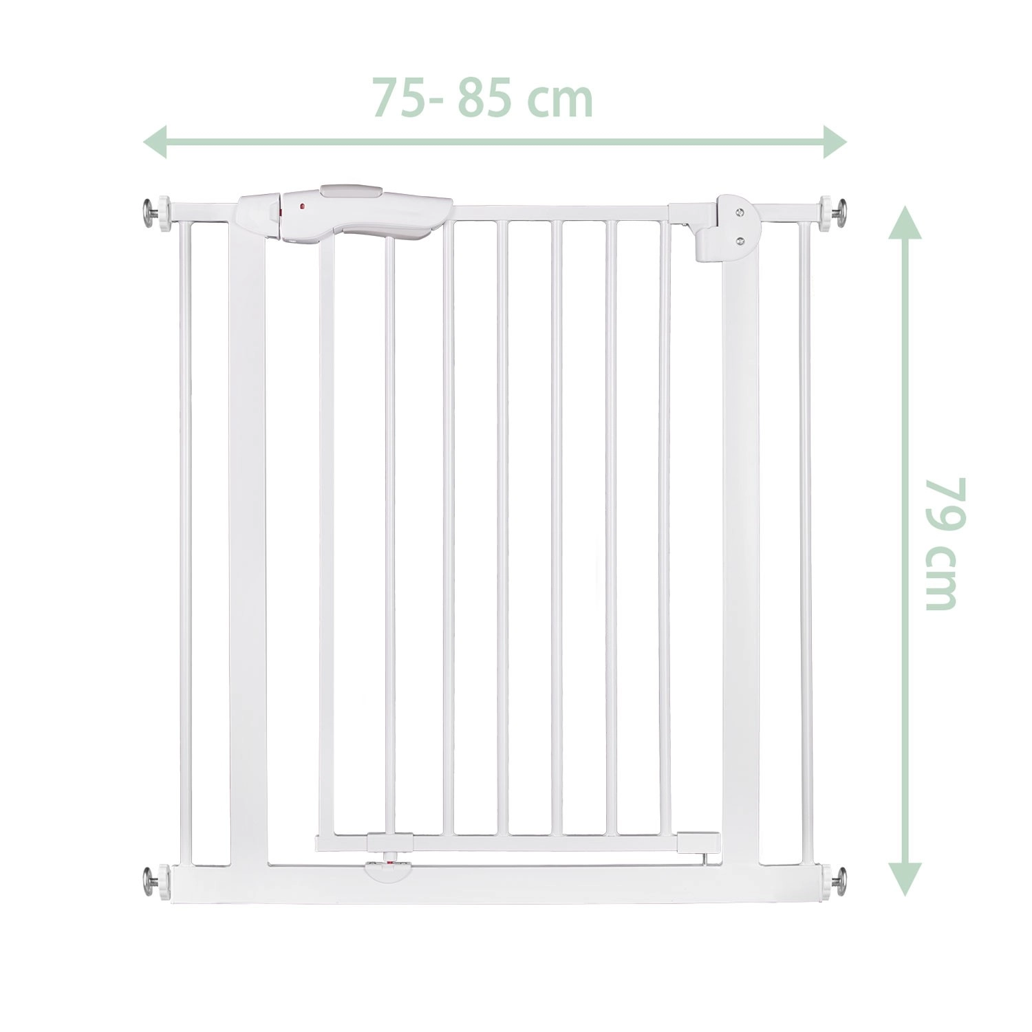 Il cancelletto consente apertura su entrambi i lati con possibilità di blocco del senso, offre comodo controllo con una mano e doppia chiusura di sicurezza. Grazie alla regolazione della larghezza 75–85 cm e ai quattro punti di fissaggio si adatta facilmente alla maggior parte delle aperture standard di porte e passaggi. Utile anche la posizione di arresto a 90° per tenerlo temporaneamente aperto.