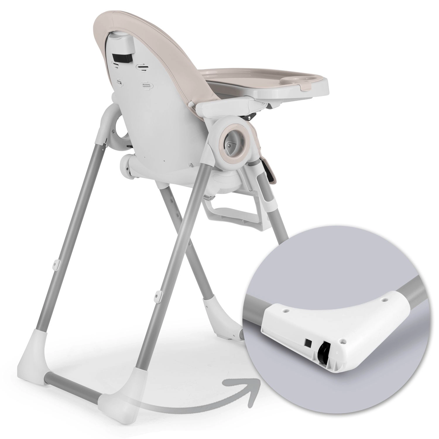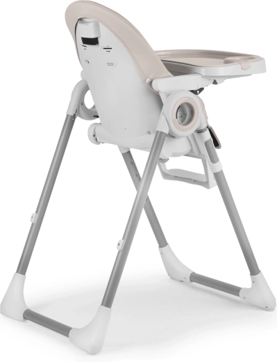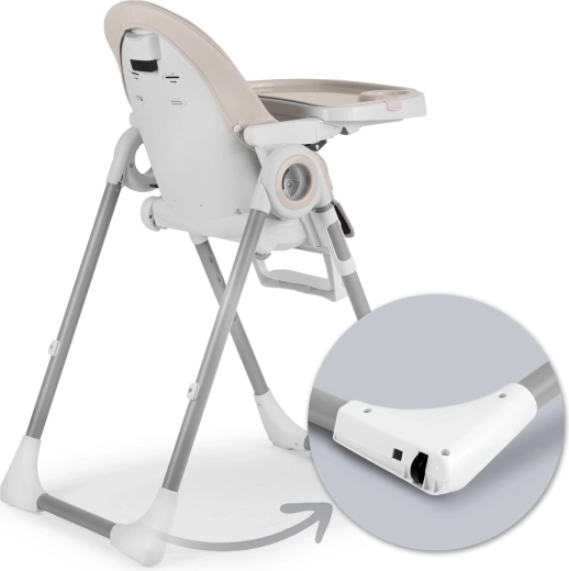 Il vassoio rimovibile con bordi rialzati e inserto aggiuntivo semplifica la pulizia dopo i pasti: l’inserto può essere tolto e sciacquato sotto l’acqua corrente. I rivestimenti sono resistenti allo sporco e si puliscono facilmente con un panno. Le ruote posteriori aiutano a spostare rapidamente il seggiolone, mentre l’ampia base e le cinture a 5 punti assicurano stabilità e sicurezza.