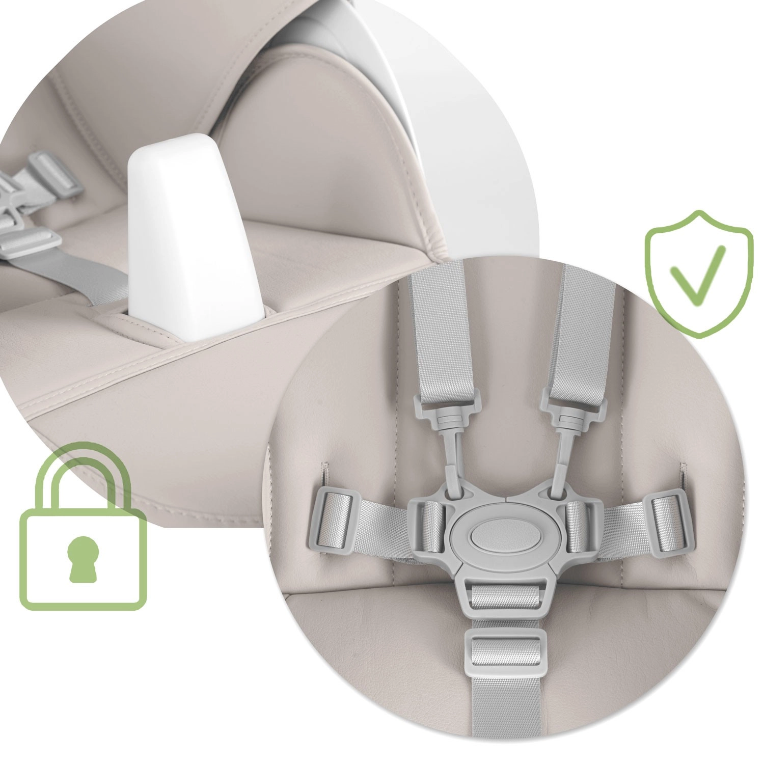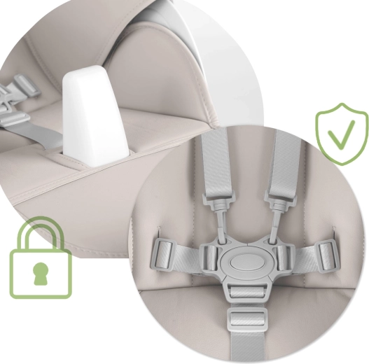 Imbottitura confortevole, cinture di sicurezza a 5 punti e blocco centrale impediscono al bambino di scivolare. L’ampia base garantisce stabilità durante i pasti e i momenti di gioco.