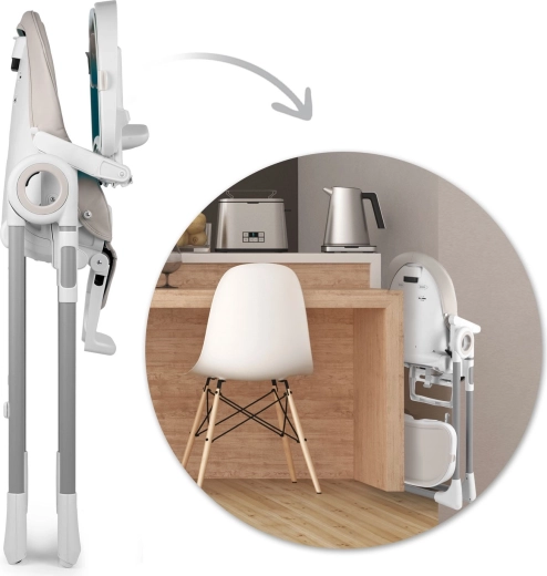 Da chiuso, il seggiolone occupa pochissimo spazio, risultando ideale anche per appartamenti piccoli. La certificazione EN 14988 conferma il rispetto degli stringenti standard europei. Nukido Belo è quindi una soluzione pratica dai primi assaggi fino ai pasti in autonomia.