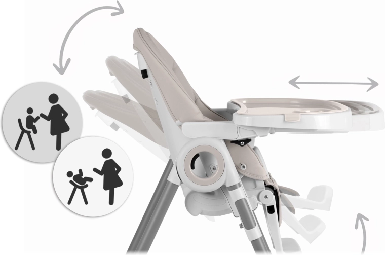 8 livelli di regolazione in altezza, 5 posizioni dello schienale e poggiapiedi regolabile permettono di usare il seggiolone dai primi mesi come sdraietta fino ai pasti in autonomia.