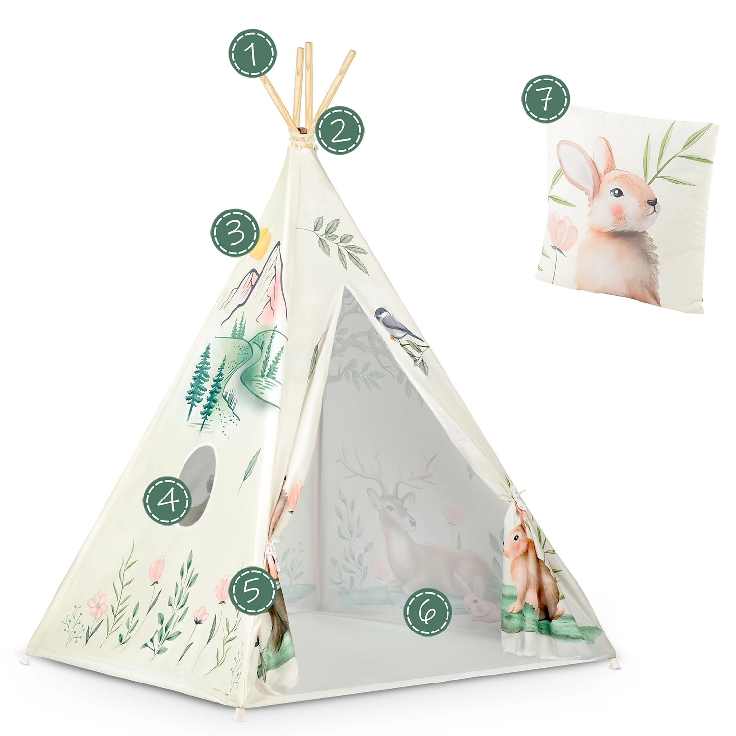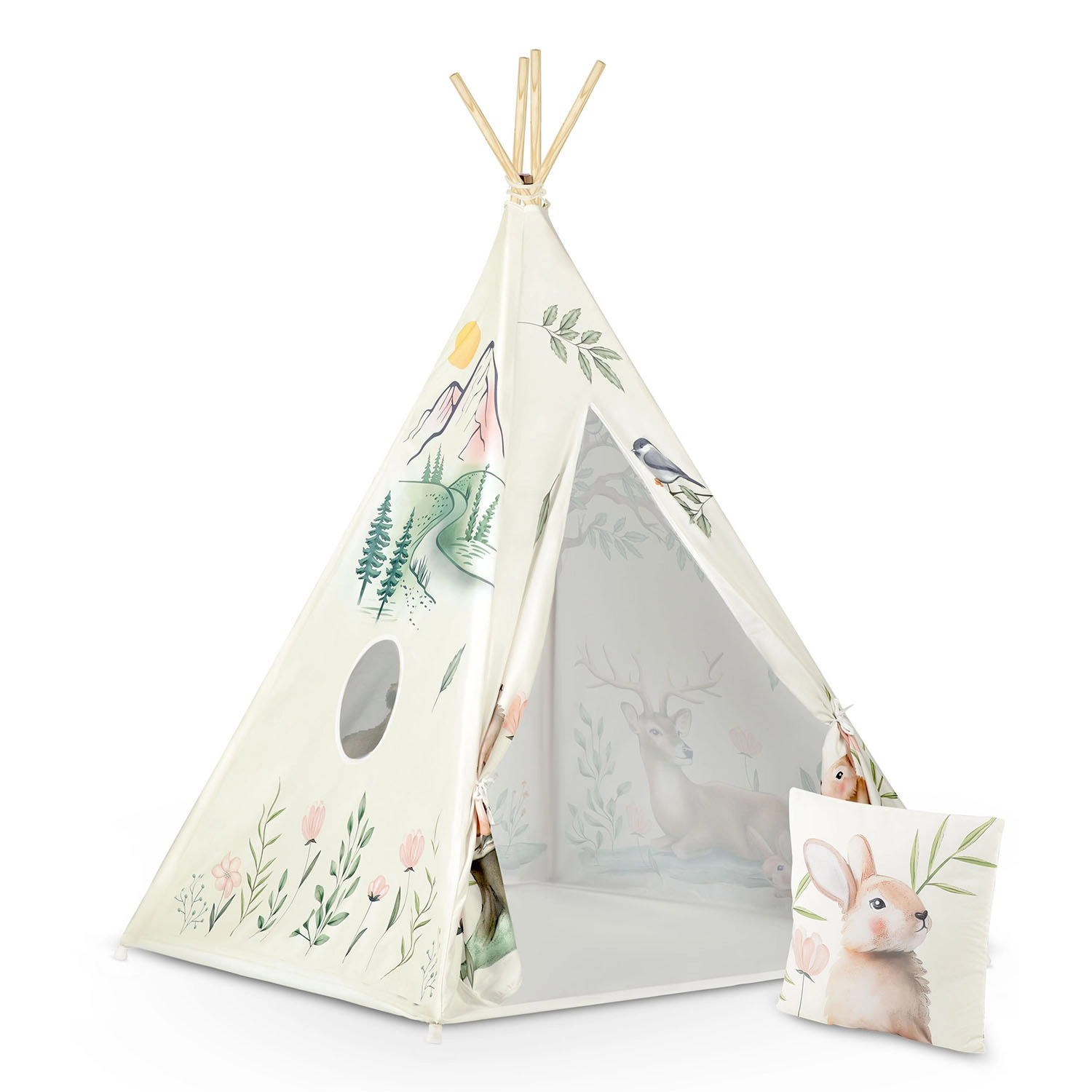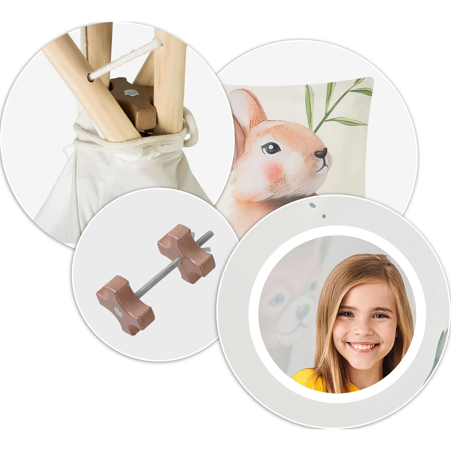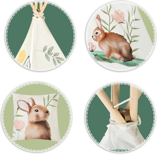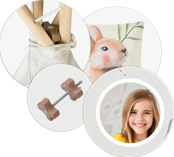 La confezione include tutto il necessario: pali in pino, stabilizzatore, fondo cucito, finestra rotonda, laccetti per il fissaggio e un morbido cuscinetto con coniglietto.