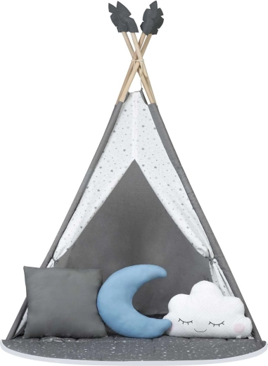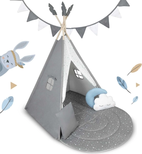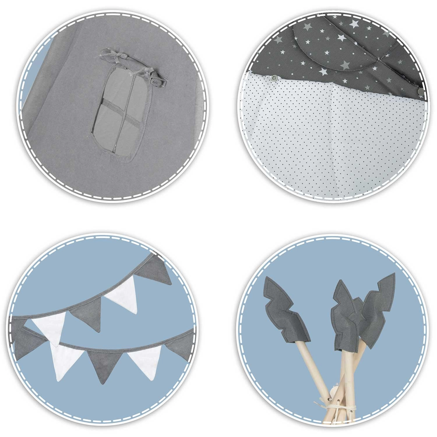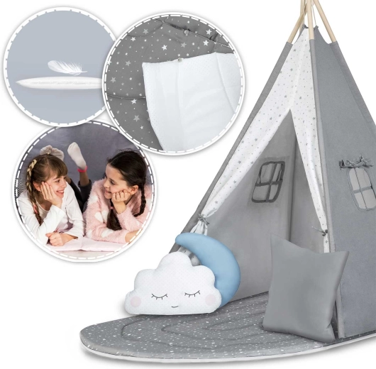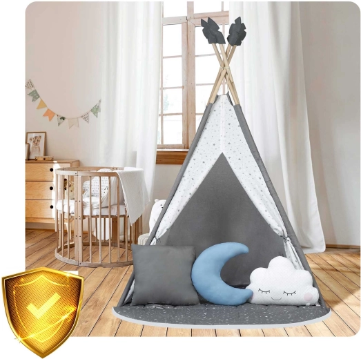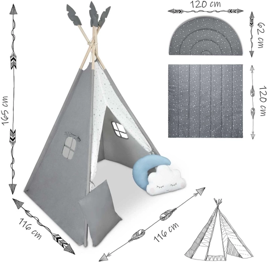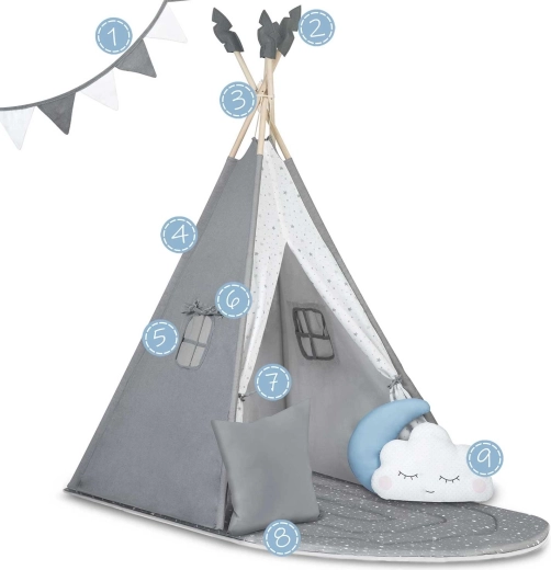 Incluso un tappetino extra spesso in due parti con inserti antiscivolo per sicurezza e calore dal pavimento – utilizzabile anche da solo come tappetino. Nella confezione trovate anche 3 cuscini (quadrato, luna, nuvoletta), una ghirlanda, piume in feltro e uno stabilizzatore per la massima stabilità della struttura con 4 pali in abete/pino. Due finestre con tendine avvolgibili e il fissaggio della porta con cordini aprono lo spazio alla fantasia e all’aerazione.