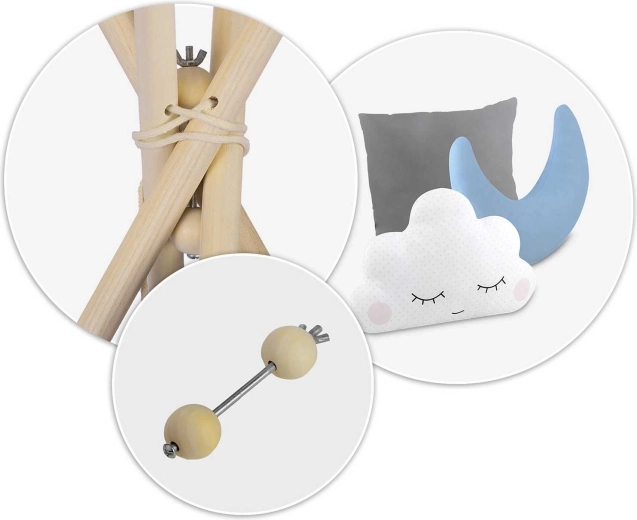 4 pali in legno, stabilizzatore incluso, ghirlanda, 4 piume in feltro e 3 cuscini (quadrato, luna, nuvoletta) compongono un set completo per un rifugio pieno di fantasia.