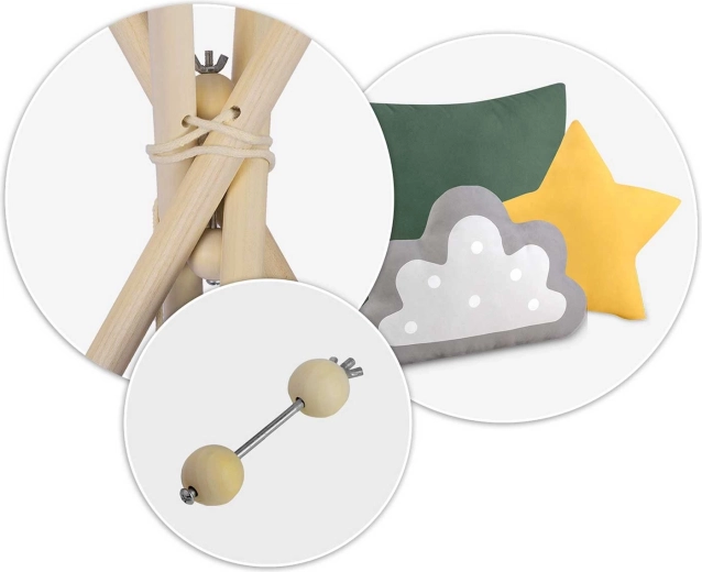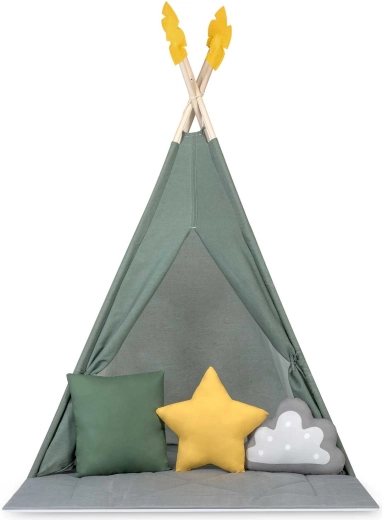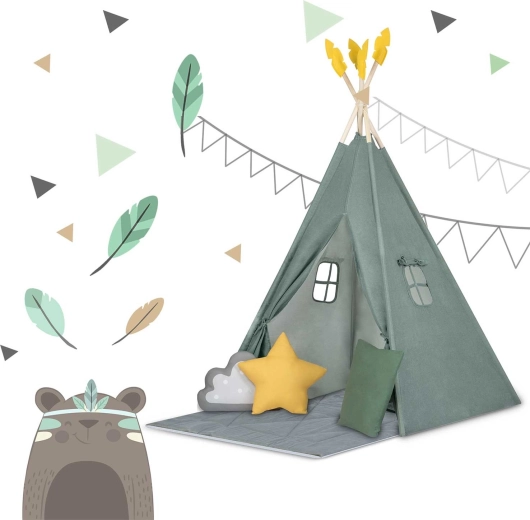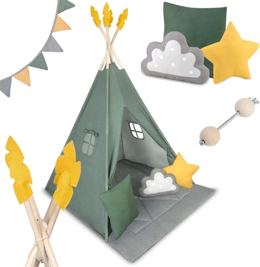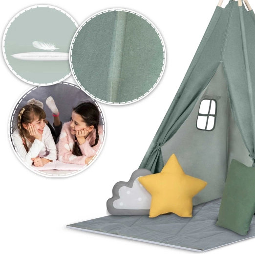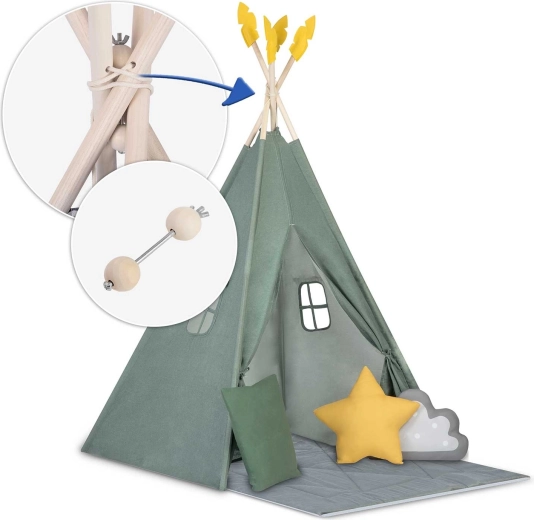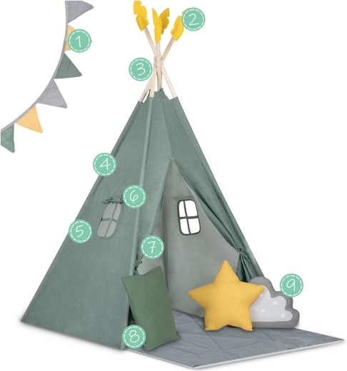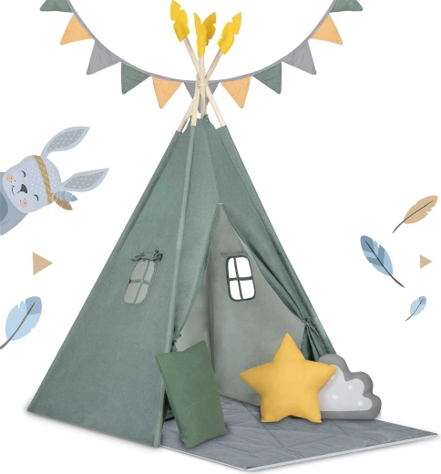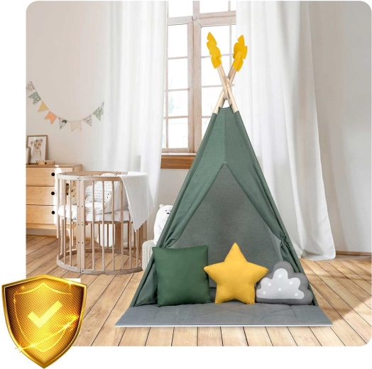 Crea per il tuo bambino un rifugio tutto suo: lo stile del teepee per bambini Nukido in colore verde. La tenda, realizzata con materiali naturali di qualità, offre tessuti morbidi e resistenti, una struttura stabile con stabilizzatore, facile da montare e una ricca dotazione. Nella confezione trovi 3 cuscini, un tappetino isolante spesso e antiscivolo, finestrelle con tendine e decorazioni. Ideale per giocare, leggere e rilassarsi nello spirito del metodo Montessori.