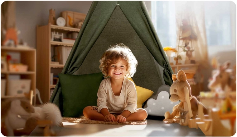 - Montaggio e trasporto facili – il teepee si monta e si ripiega rapidamente, adatto sia alla cameretta sia a una terrazza coperta.