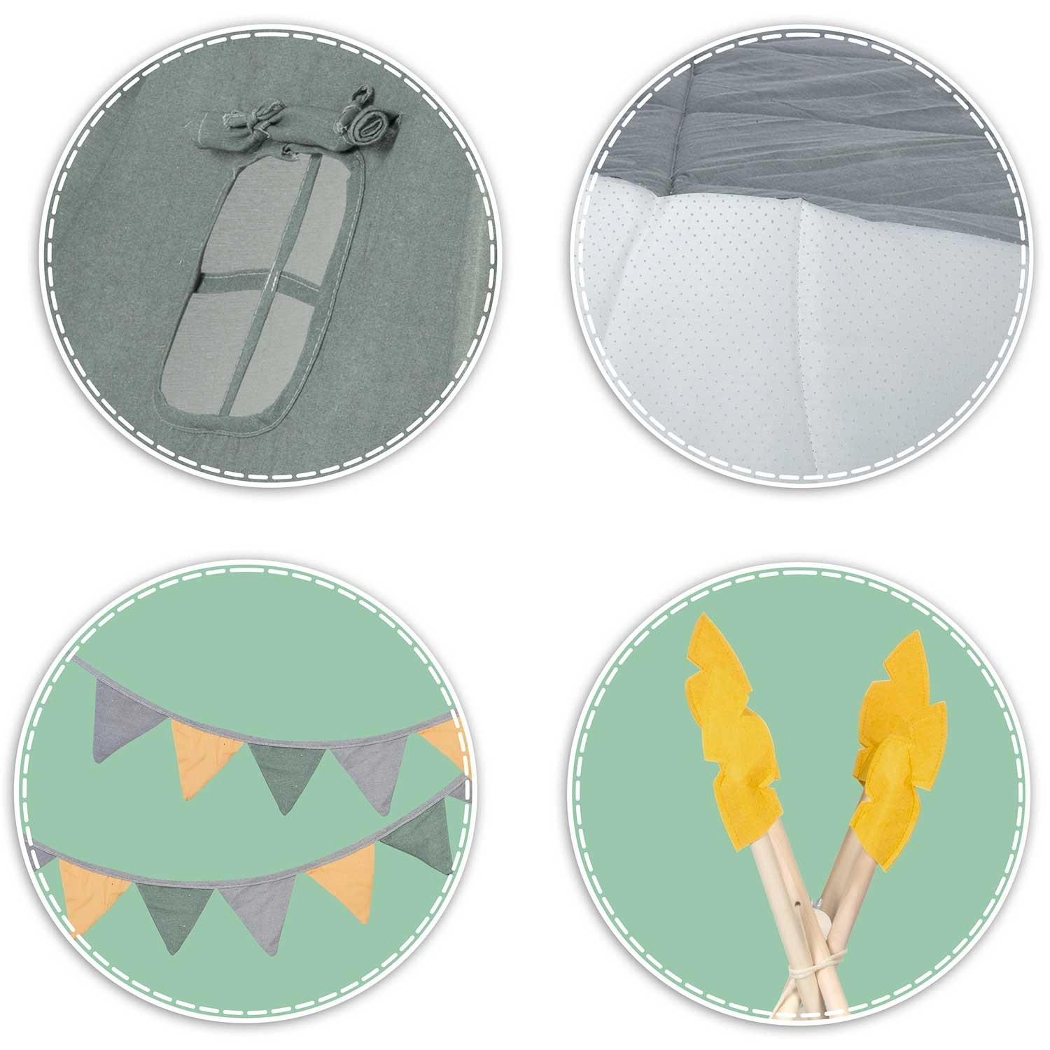 Il teepee per bambini Nukido è un angolo di gioco accogliente che si integra naturalmente nella cameretta. Il mix di cotone premium con alta grammatura 175 g/m2 è traspirante, morbido e robusto, quindi resiste alle avventure di ogni giorno. L’armonioso verde con accenti giocosi favorisce lo sviluppo sensoriale e stimola la fantasia.