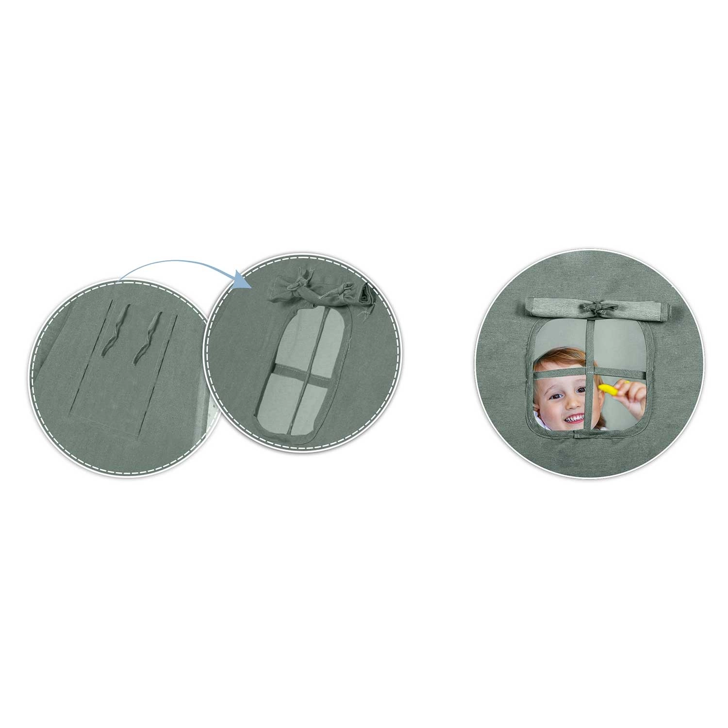 La finestrella con tendina e laccetti permette di arieggiare, giocare a nascondino e guardare fuori. Le tende dell’ingresso si legano facilmente per un accesso comodo.