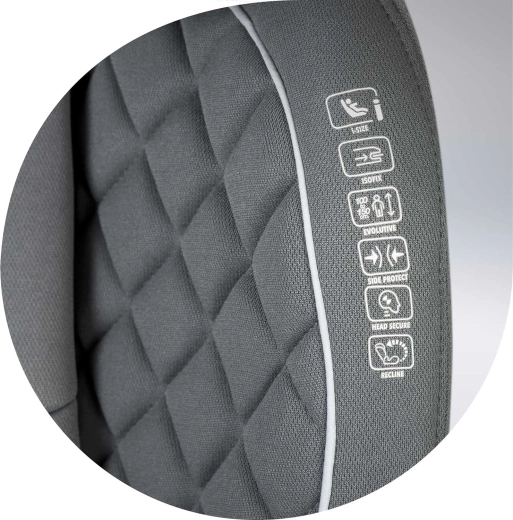 I materiali premium combinano struttura rinforzata, imbottitura EPS sagomata e morbide imbottiture spesse per un comfort duraturo durante il viaggio. Il rivestimento è facilmente removibile e lavabile, per una manutenzione semplice. Il seggiolino supporta il corretto passaggio della cintura di sicurezza ed è dotato di guide multipo nto per un posizionamento corretto.