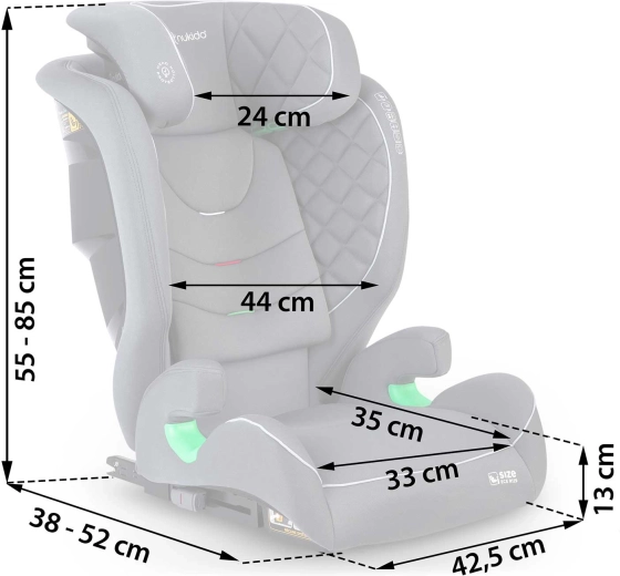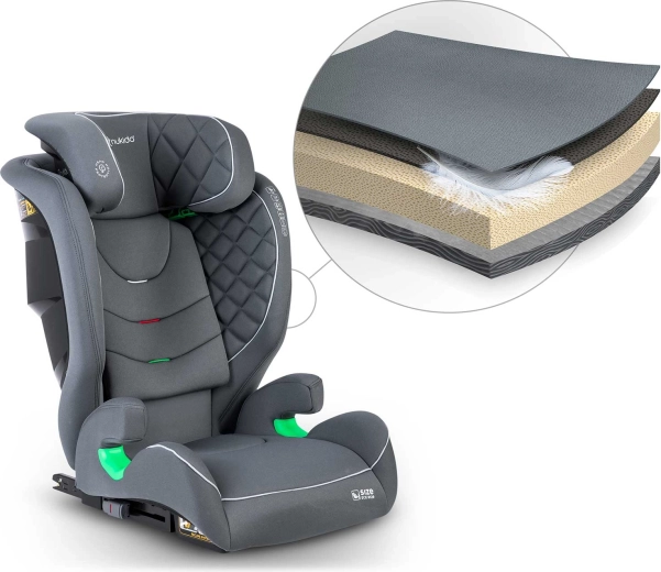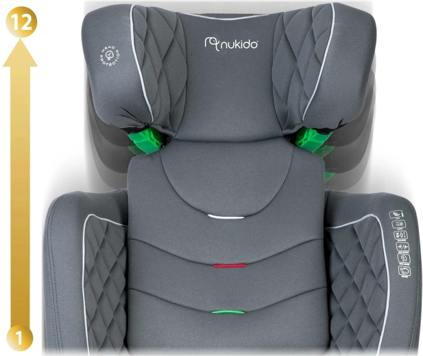 Il seggiolino auto Nukido Louis cresce con il bambino da circa 4 a 12 anni e soddisfa il più severo standard di sicurezza ECE R129 (i-Size). L'installazione stabile con ISOFIX e la studiata SIP – Side Impact Protection proteggono testa, collo e colonna vertebrale in caso di impatto laterale. Due step di regolazione dell'inclinazione e 12 posizioni del poggiatesta assicurano postura ergonomica e comfort in ogni fase della crescita.