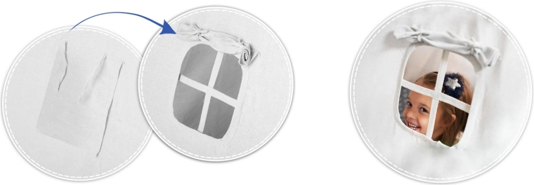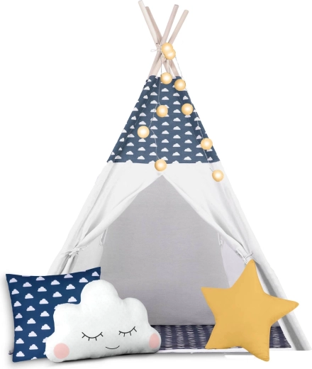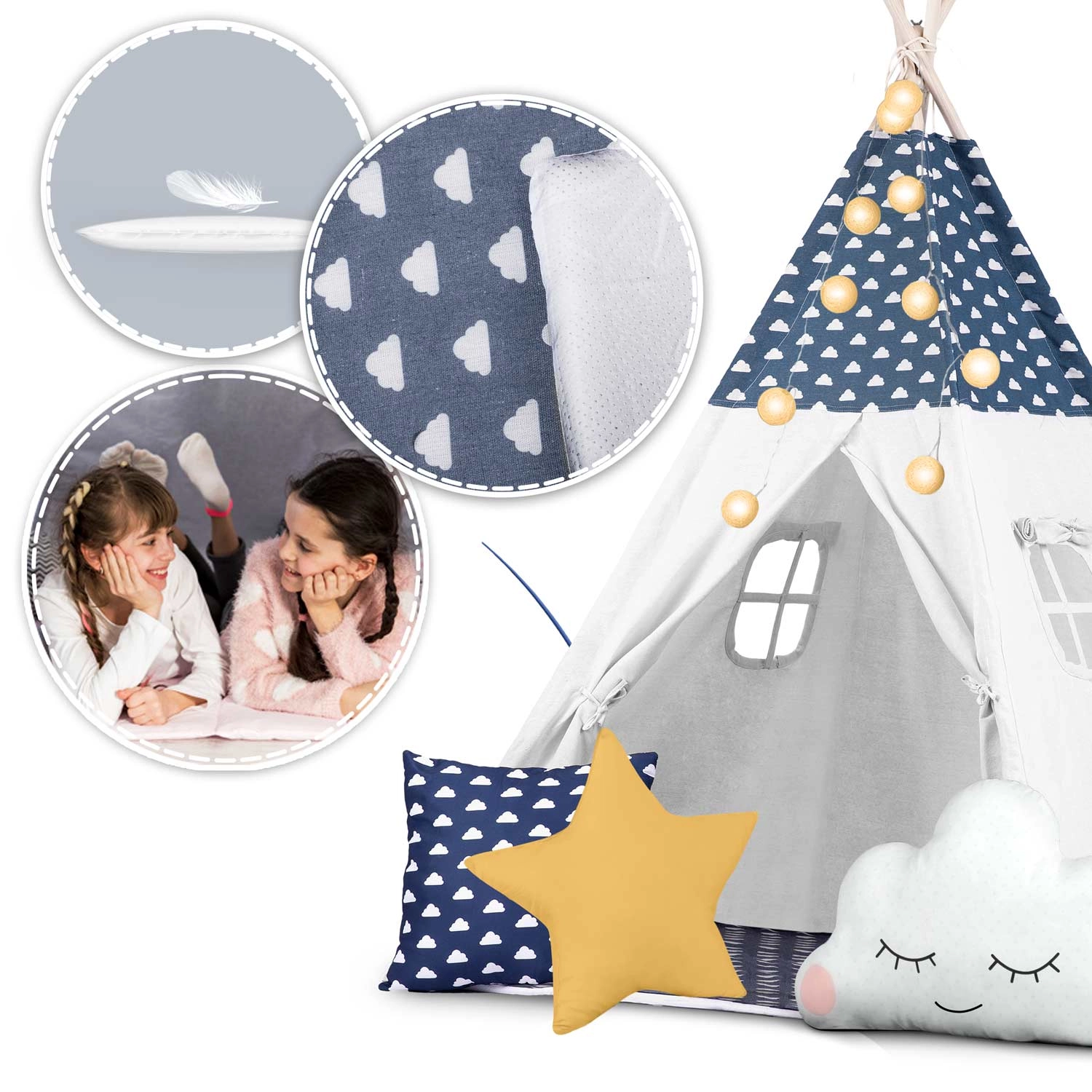Il set comprende un tappetino spesso e morbido con finitura antiscivolo, utilizzabile anche separatamente come tappeto. Tre cuscini dalle forme giocose (nuvola, stella e fantasia) aumentano il comfort e il valore decorativo della cameretta. Dettagli pratici come le tende frontali scorrevoli e la finestrella con tendina favoriscono il divertimento e la ventilazione.