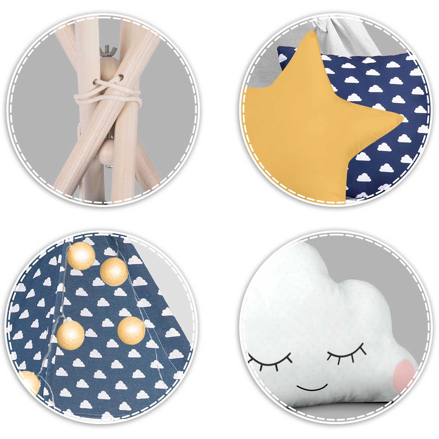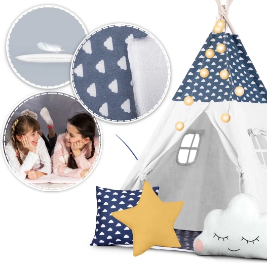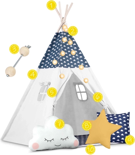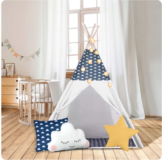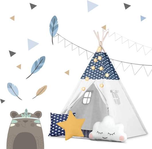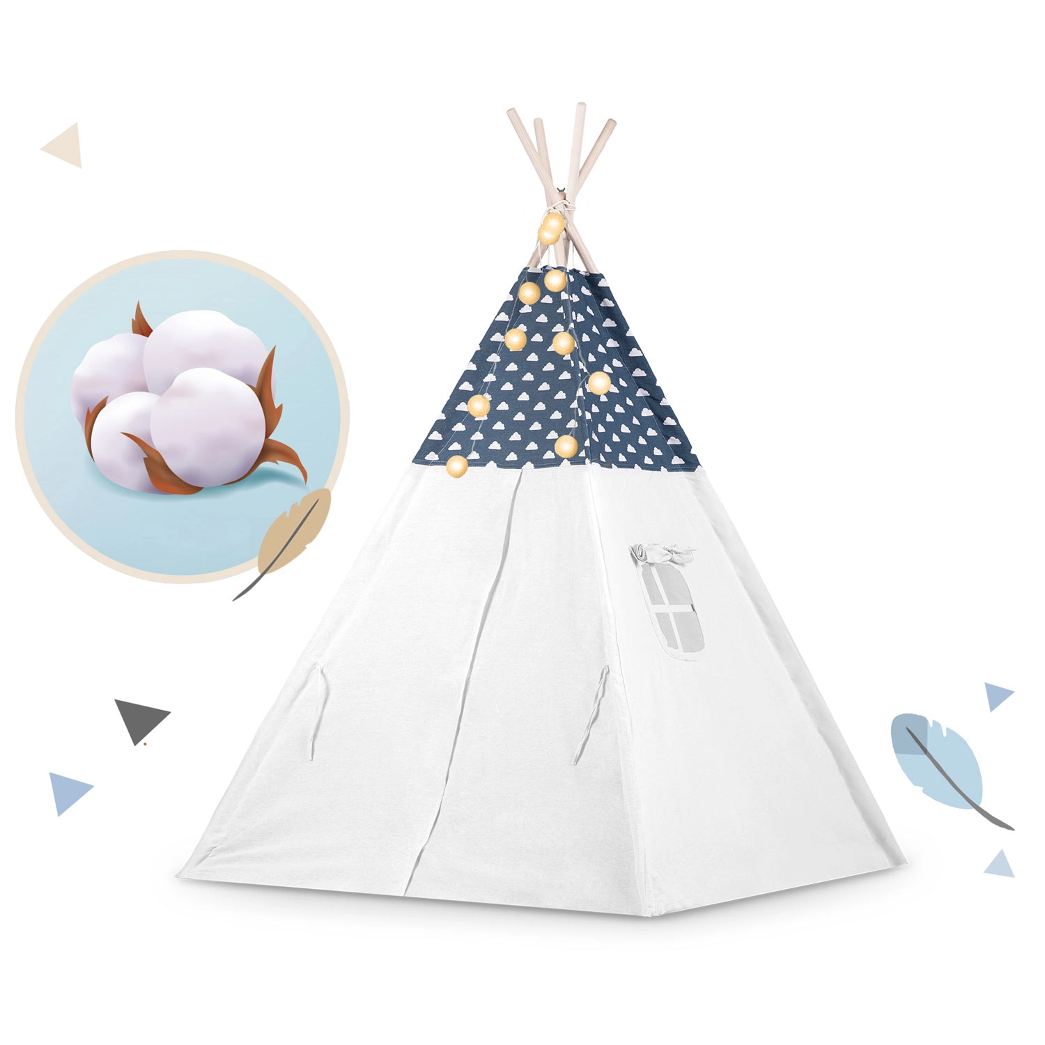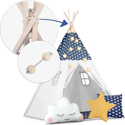 Il teepee è realizzato in cotone premium 100% con grammatura superiore per morbidezza, durata e ottima traspirabilità. Le aste in legno di pino garantiscono una struttura solida e stabile.