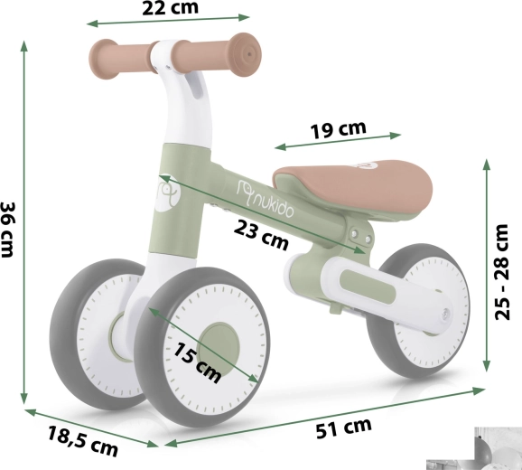 Sostieni lo sviluppo naturale di equilibrio e coordinazione con la balance bike Nukido. La struttura ultra-stabile con tre ruote, il baricentro basso e la sella morbida in schiuma danno sicurezza ai bambini fin dai primi passi. Grazie alla regolazione dell’altezza della sella 25–28 cm, la bici senza pedali cresce con il tuo bambino, mantenendo la giusta ergonomia e comfort.