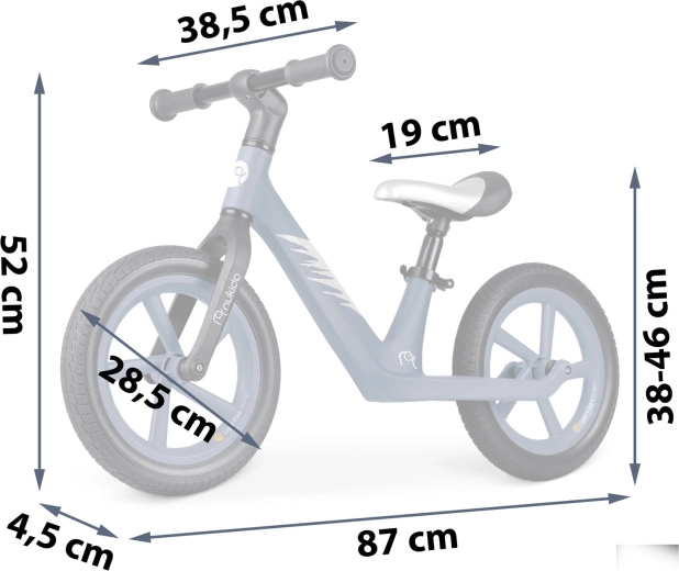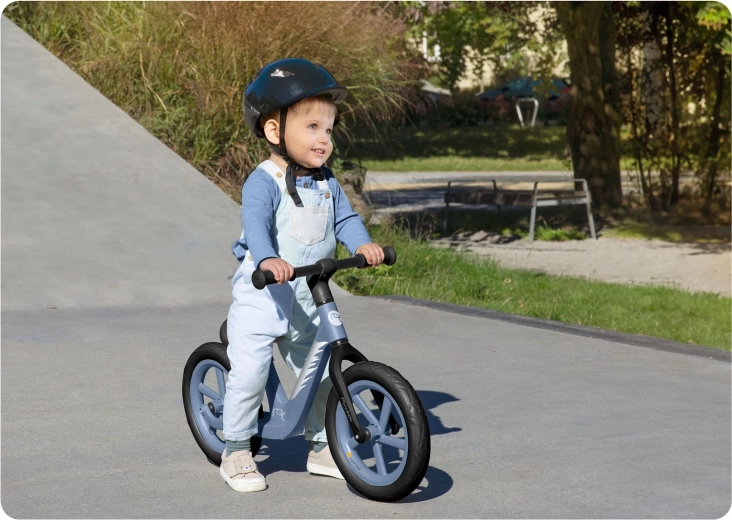 Grazie all’altezza sella continuamente regolabile (circa 35–41 cm) la balance bike cresce con il bambino e assicura una postura ideale in ogni fase dello sviluppo. Le ruote EVA da 12" antiforatura assorbono le irregolarità e non richiedono manutenzione, le manopole in gomma con terminali proteggono le mani dei bambini e offrono sicurezza nella guida.