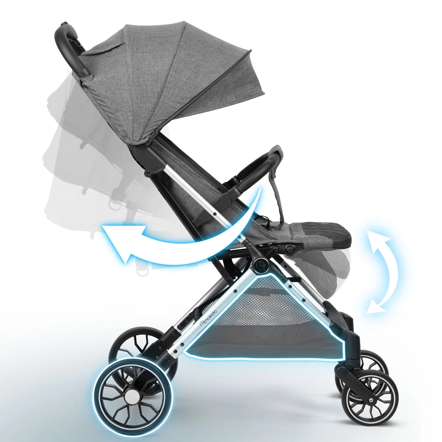 Il passeggino Nukido Paseo si chiude con una mano in pochi istanti fino alla dimensione di un bagaglio a mano. Si ripone facilmente nel bagagliaio dell'auto e si puf2 portare in aereo. Non mancano una comoda maniglia per il traino e una sacca protettiva incluse nella confezione.