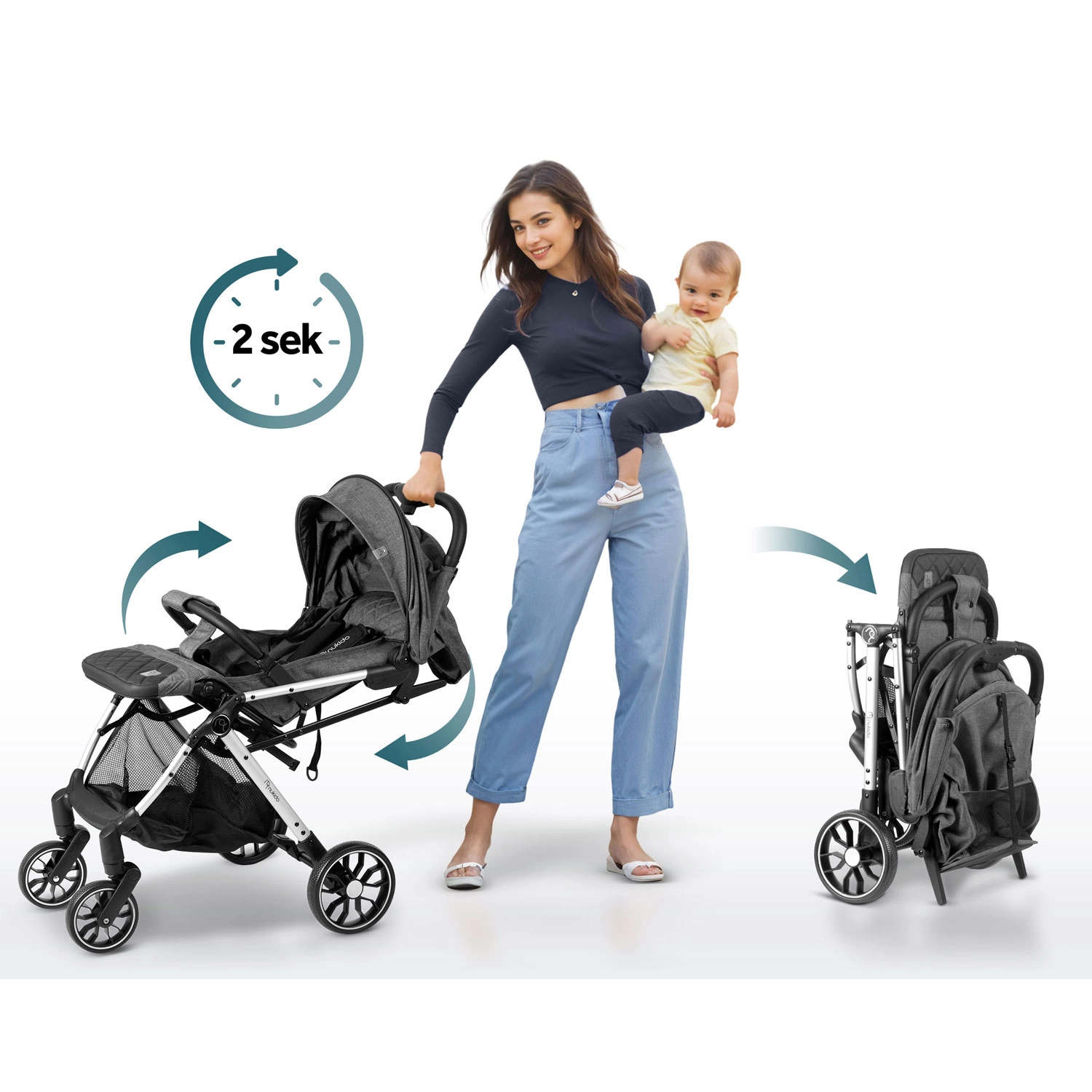 Goditi passeggiate confortevoli in citte0 e fuori strada con il passeggino sportivo Nukido Paseo. Questo passeggino leggero e compatto si chiude con una mano in 2 secondi fino alla dimensione di un bagaglio a mano. Offre ruote anteriori girevoli a 360b0 con sospensioni, grandi ruote posteriori per stabilite0, cintura di sicurezza a 5 punti, schienale reclinabile fino alla posizione nanna, poggiapiedi regolabile e capottina estensibile con protezione dalla pioggia e dai raggi UV. Inclusi parapioggia e coprigambe per un utilizzo tutto l'anno.