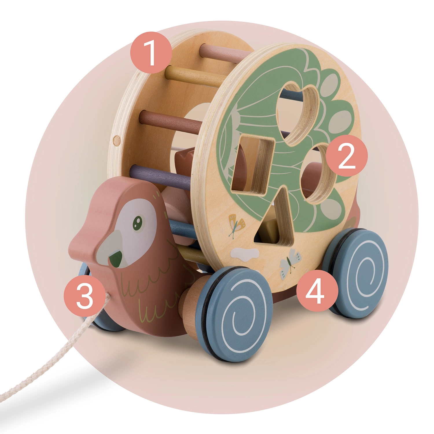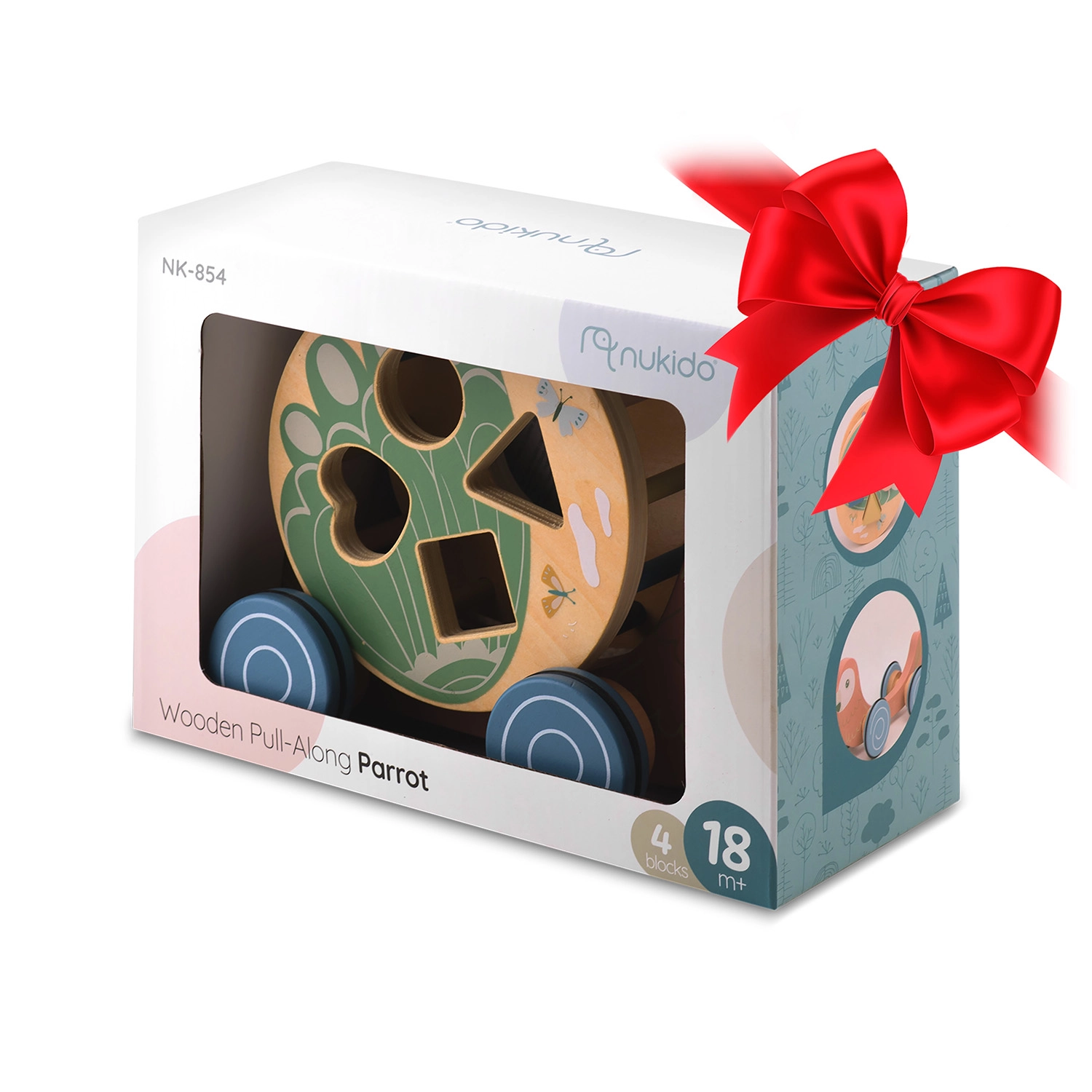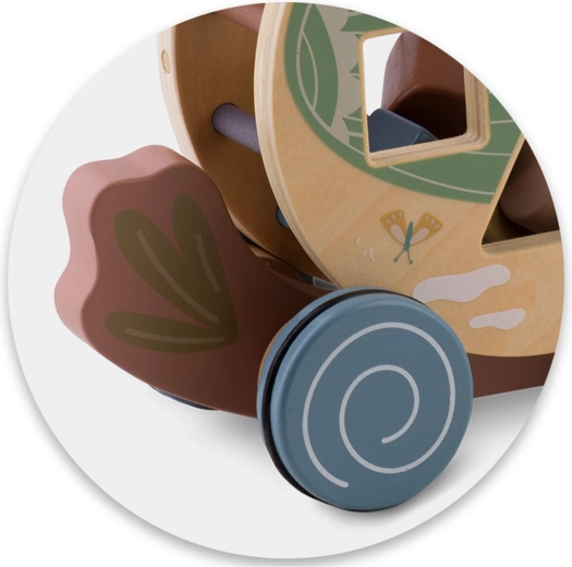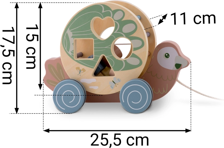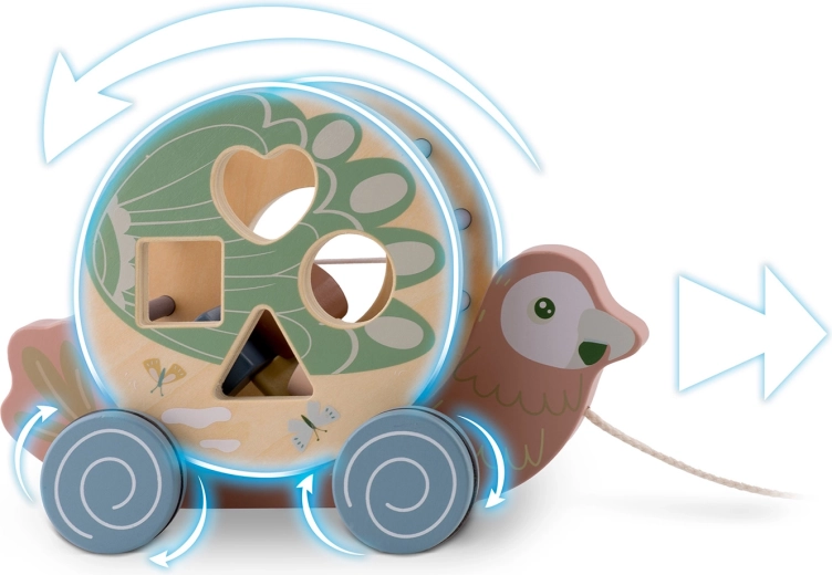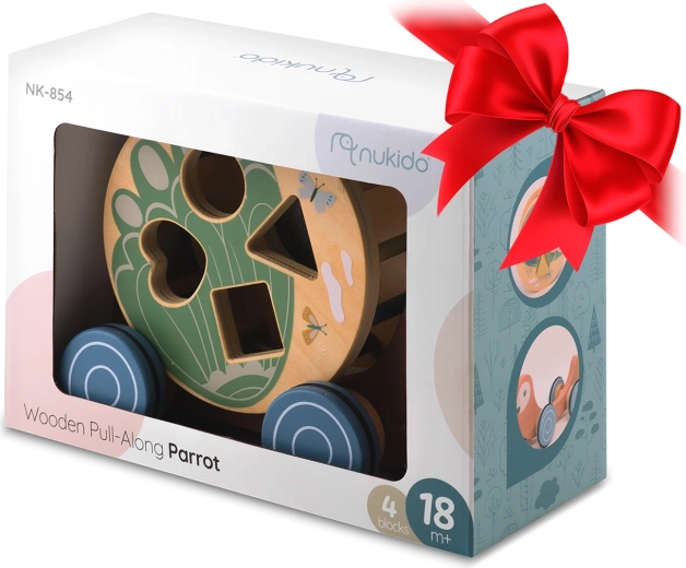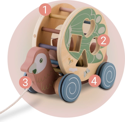 Il pappagallo in legno di NUKIDO unisce due attività amate in un solo gioco: animaletto a traino con ruote e sorter di forme rotante. In movimento, il tamburo con intagli (cuore, quadrato, cerchio, triangolo) ruota, guidando i bambini alla scoperta del rapporto causa–effetto e incoraggiando un movimento gioioso. I colori pastello, i bordi lisci e la robusta struttura in legno assicurano un divertimento sicuro e duraturo.