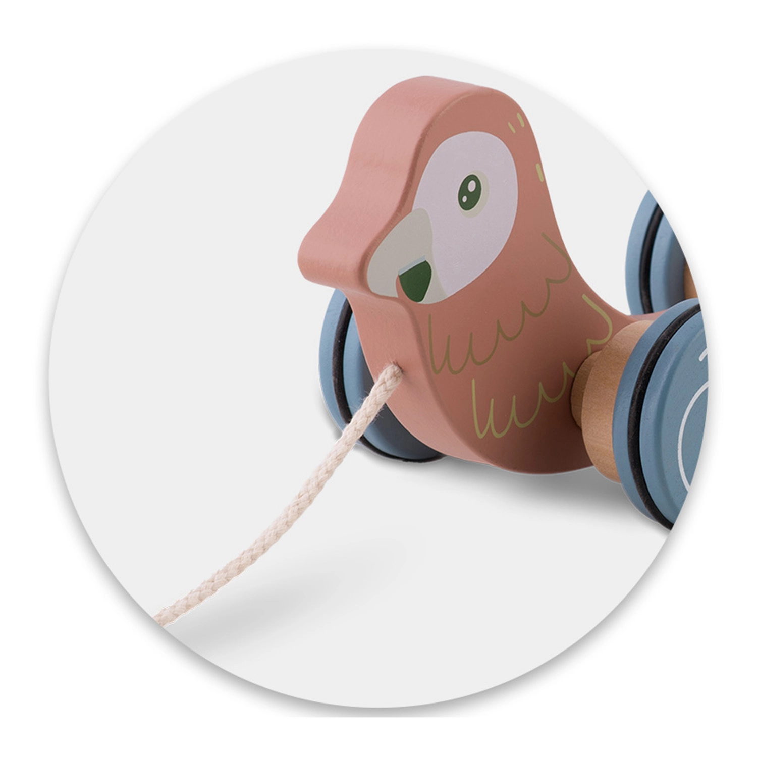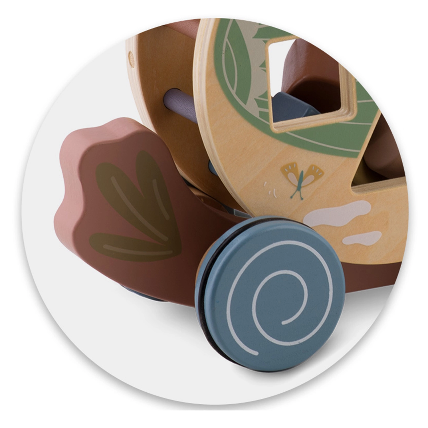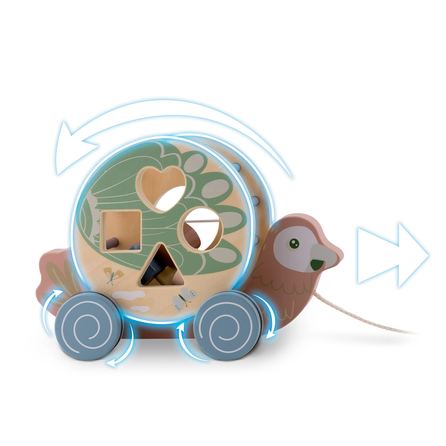 Il pappagallo in legno di NUKIDO unisce due attività amate in un solo gioco: animaletto a traino con ruote e sorter di forme rotante. In movimento, il tamburo con intagli (cuore, quadrato, cerchio, triangolo) ruota, guidando i bambini alla scoperta del rapporto causa–effetto e incoraggiando un movimento gioioso. I colori pastello, i bordi lisci e la robusta struttura in legno assicurano un divertimento sicuro e duraturo.