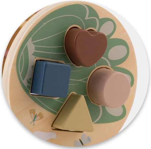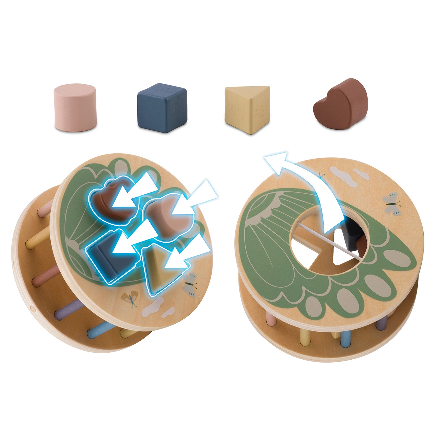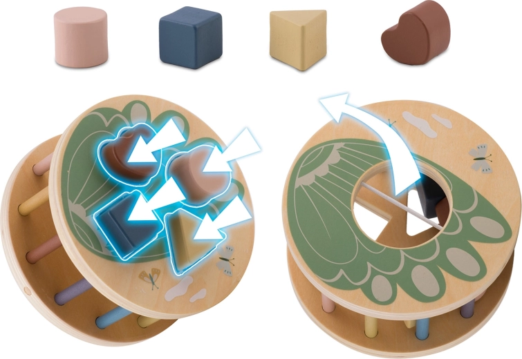 Il tamburo con intagli ruota durante il traino, motivando i bambini a inserire le forme corrette e insegnando il rapporto causa–effetto, oltre al riconoscimento di colori e forme.