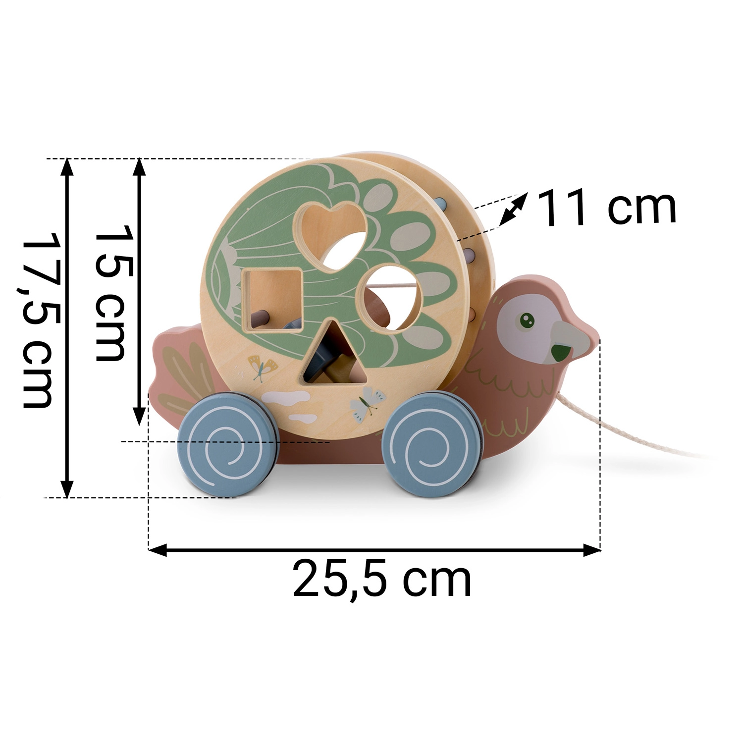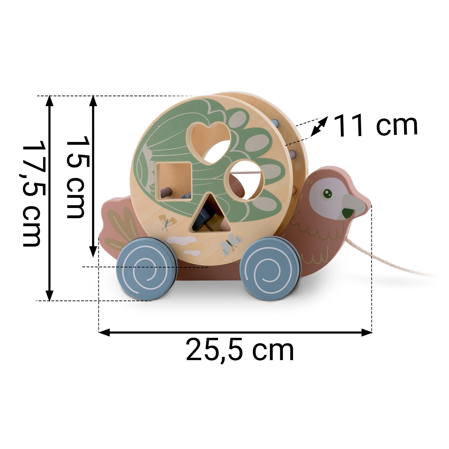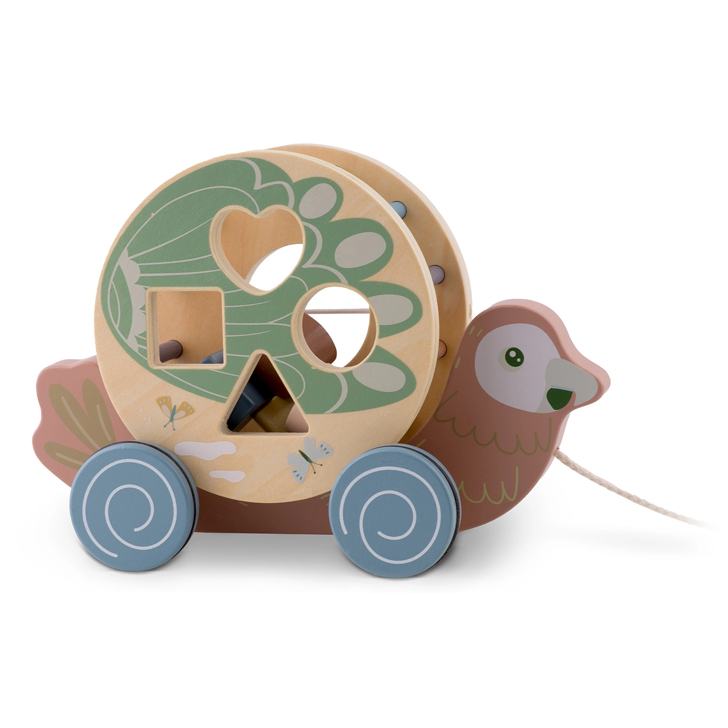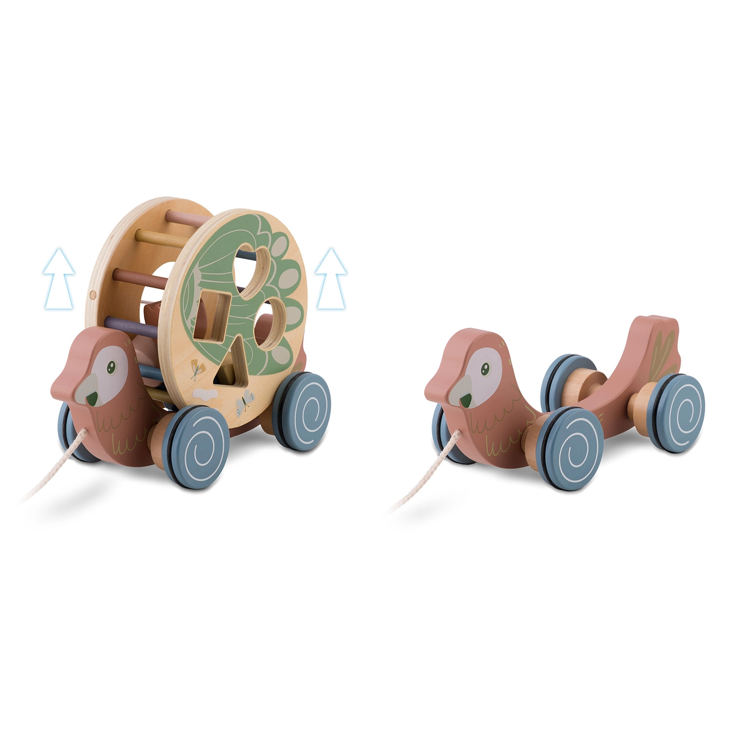 - pappagallo a traino con cordino, tamburo–sorter, forme in legno
